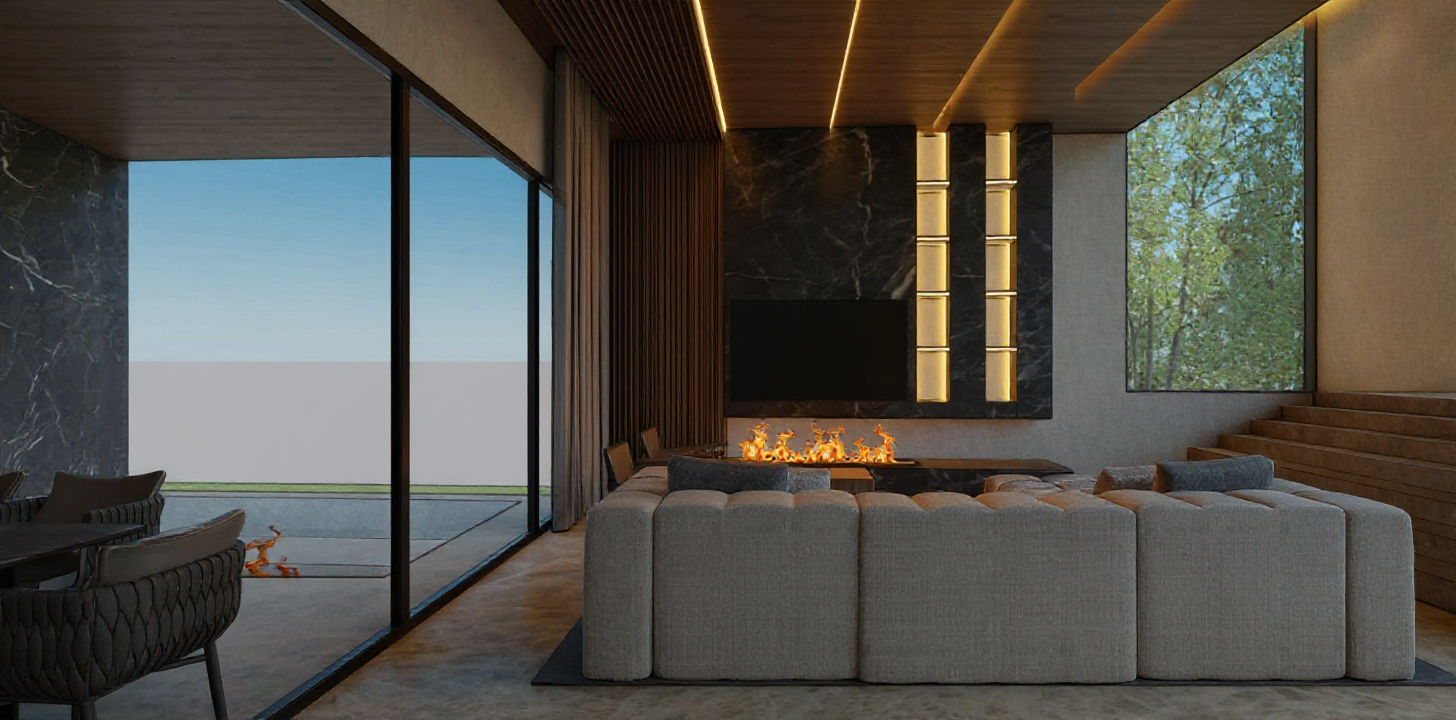 add line led lights on the ceiling floor is marble make it during the brightest time of the day add forest trees in the background