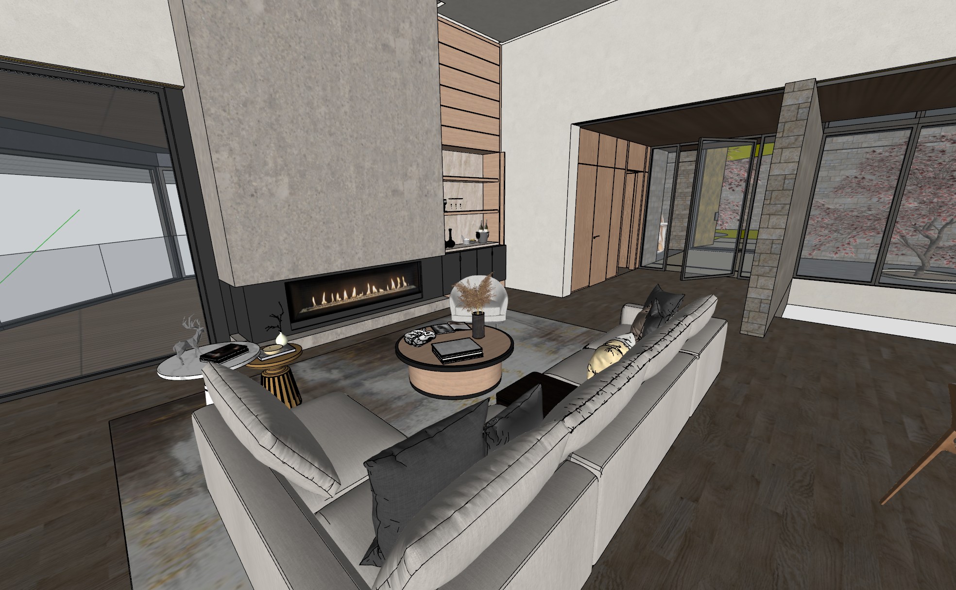living room to look realistic lakefront hill view from the terrace behind the window on the left side