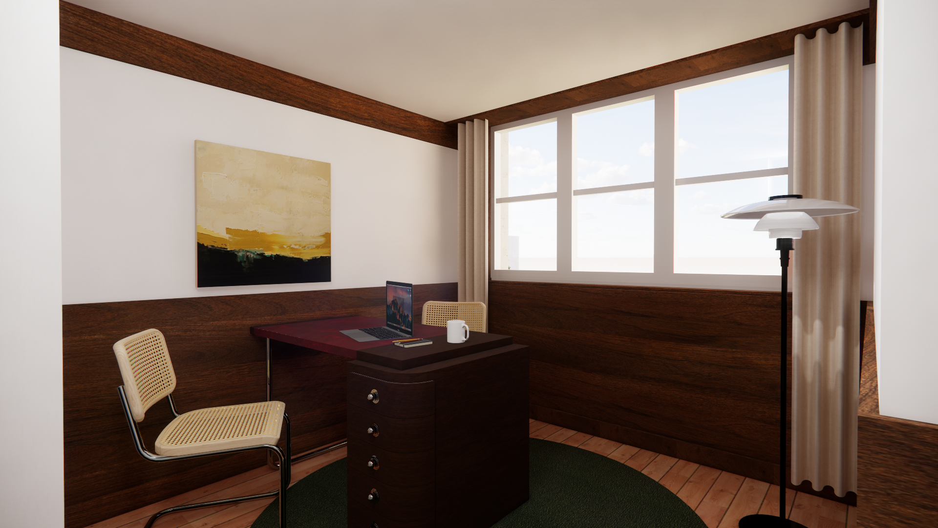 keep the vue of this interior keep the volums keep the materials enhance materials add light from the floor lamp add bushes and blue sky behind the window make a super realistic light and vue high quality