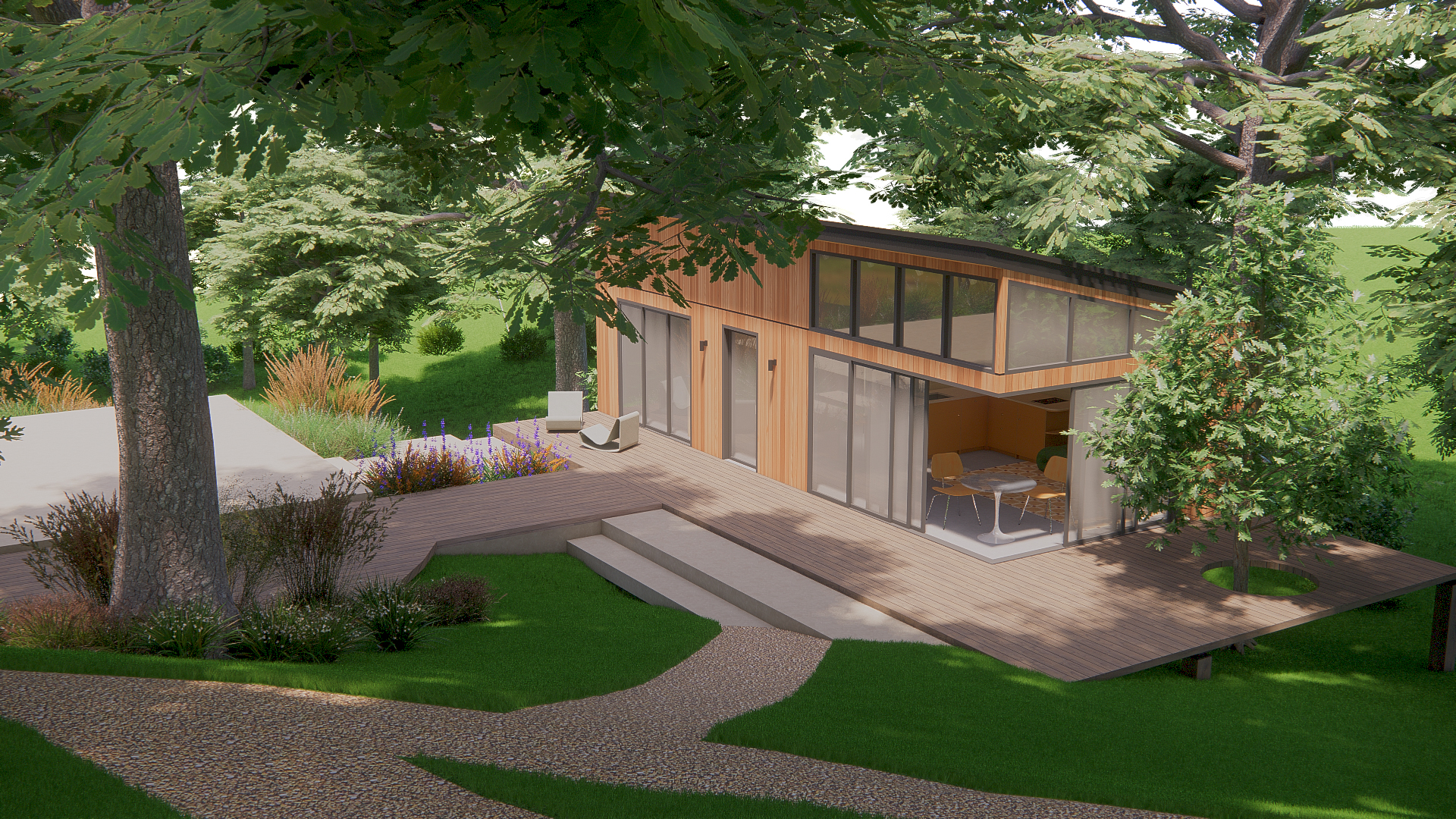 improve realism warm summer light no bloom replace white background with oak trees keep all design materials colors and composition unchanged no design material and colors changes