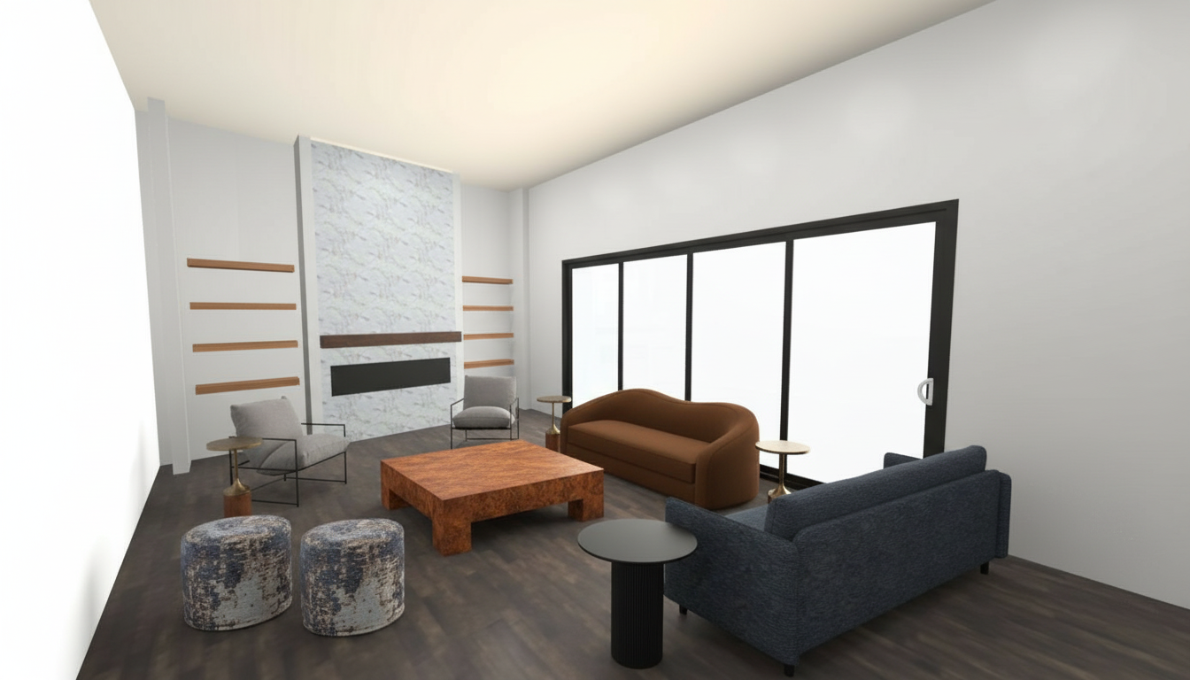 add warm light inside the rooms add curtains time of day dusk add moving blurred car passing make the image 30 lighter with more detail in the bricks vertical lines next to the windows are lights keep the dark bricks color make the white column on the ground floor with the dark bricks