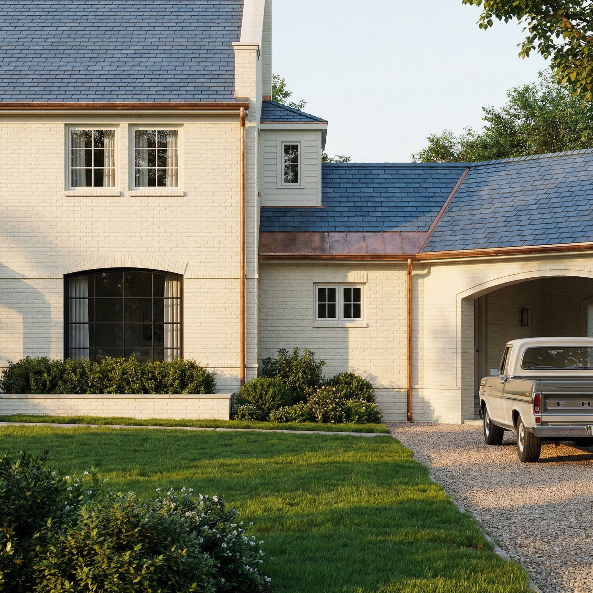 modern farmhouse rustic stone gables vertical wood siding stone tower large glass windows tall grass foreground