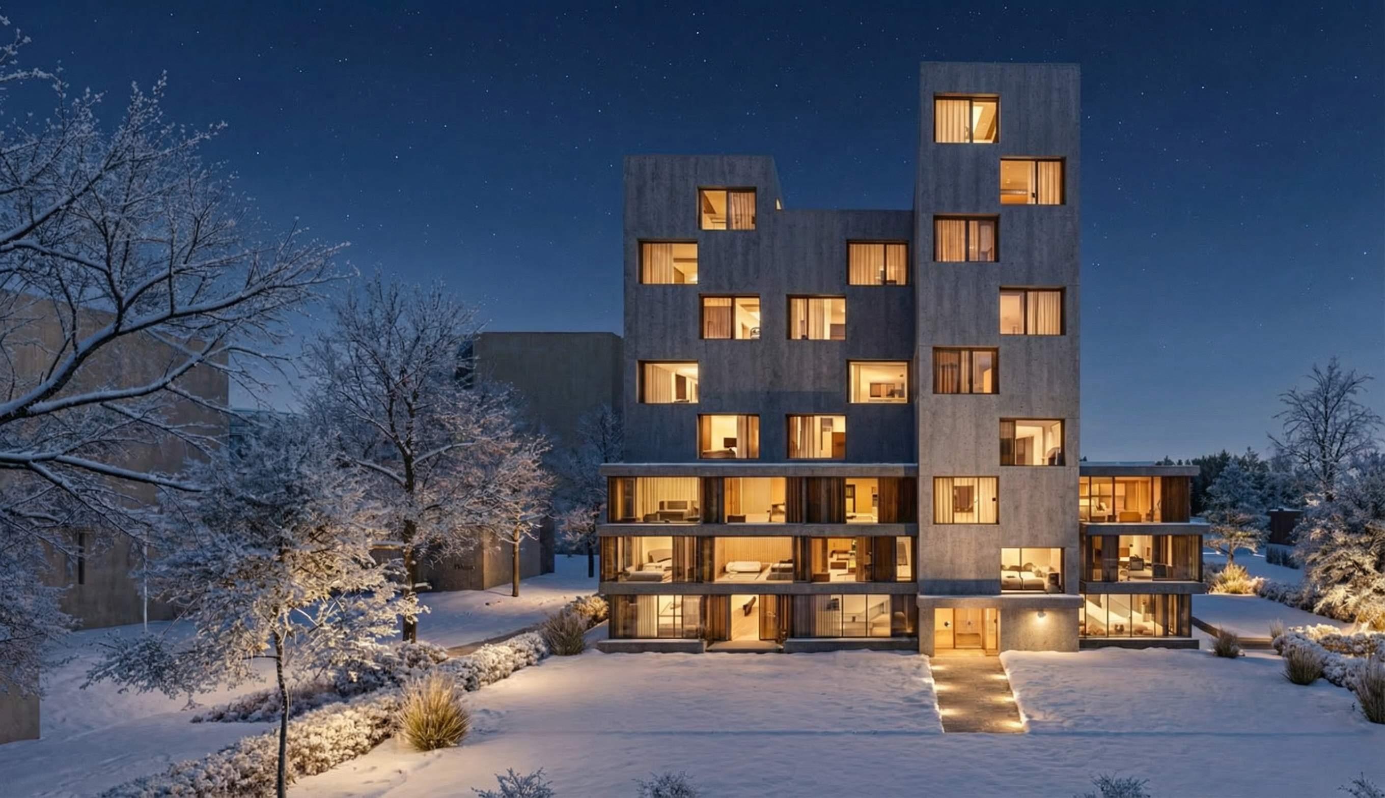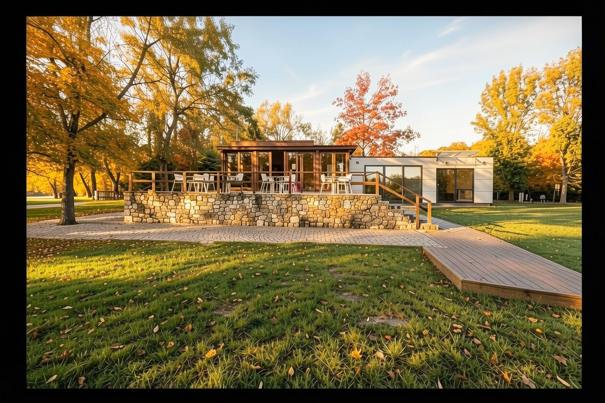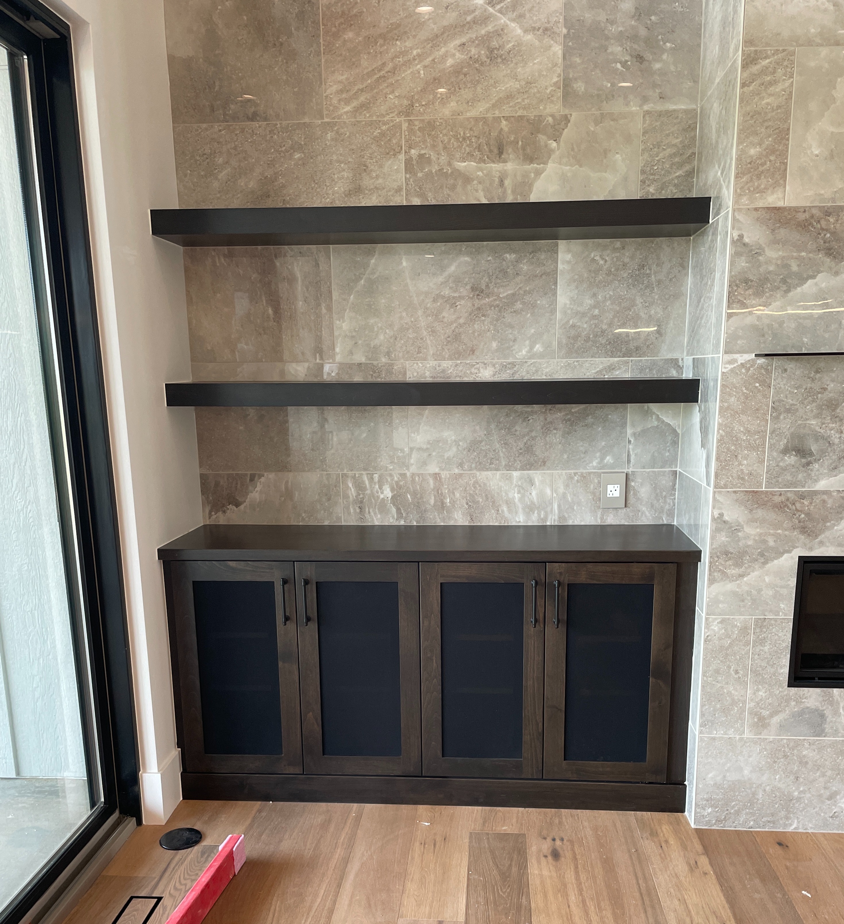 do not change the cabinets in any way preserve the exact cabinet colors materials finishes dimensions door and drawer styles hardware spacing alignment and all geometry exactly as shown do not alter the countertop shape backsplash appliances flooring lighting fixtures or wall structure only remove the construction materials clutter and mess from the scene clean the room and make it look finished and staged add a few simple tasteful home accessories appropriate for the style of the space but do not add or remove any furniture windows or architectural elements maintain the original lighting direction and realism enhance clarity and polish the photo while keeping the cabinetry and room design completely unchanged do not alter the lighting to keep the cabinet colors as they are in the image add carpet stage all of the floating shelves and top with modern minimalistic decore add a simple view out the patio door
