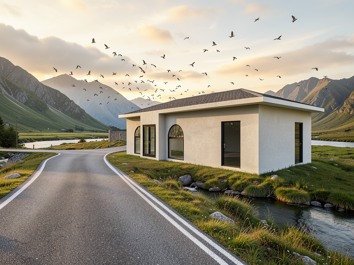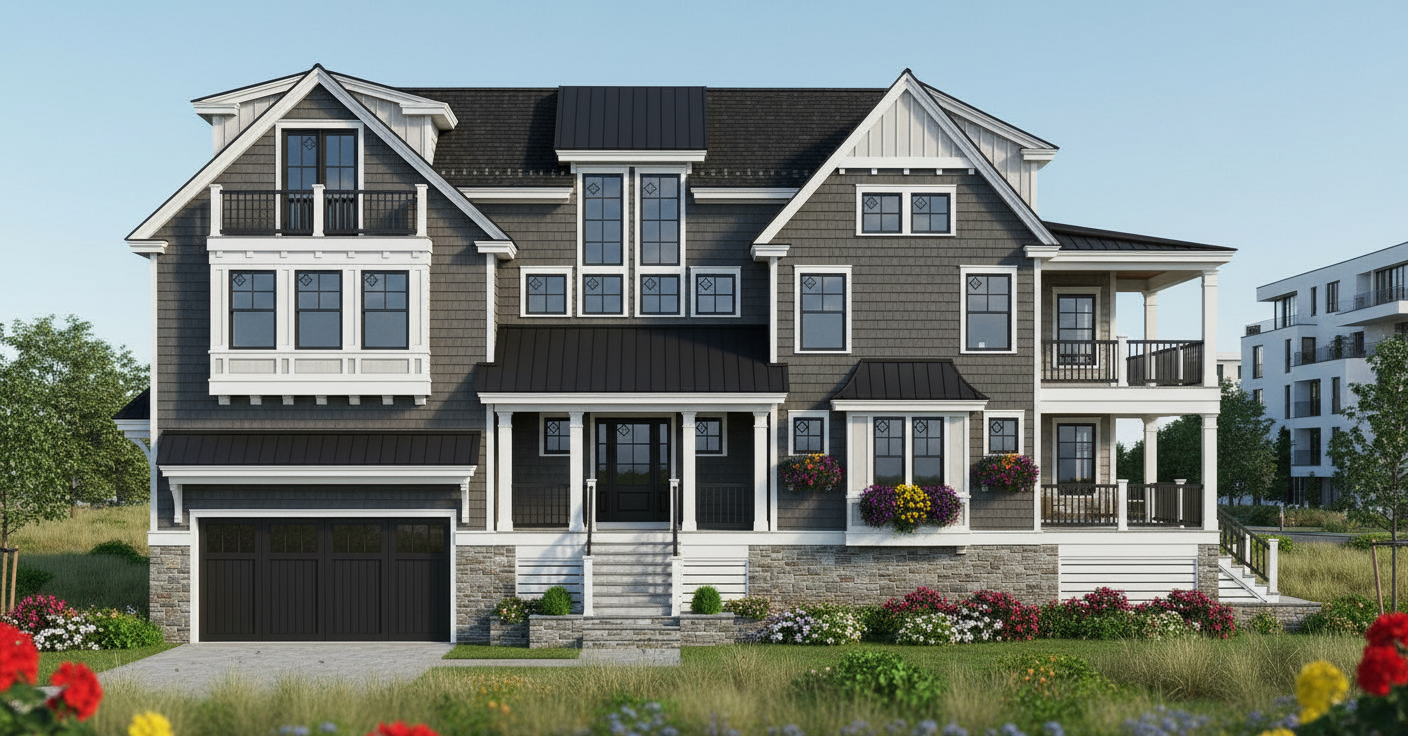 make as photorealistic as possible while keeping textures the same as shown grassy backyard in a farmland area of croton ohio nice lighting remove any text use the following finishes 65625d horizontal siding poured concrete foundation pewter certainteed dimensional shingles wood to be treated unfinished