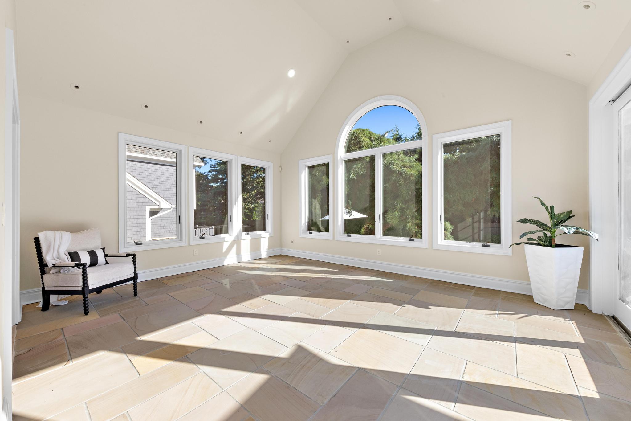 remove chair on left of room add a large sectional white couch facing the wall on the right add a large modern fan to ceiling replace the plant on the right with a wicker pot with an olive tree