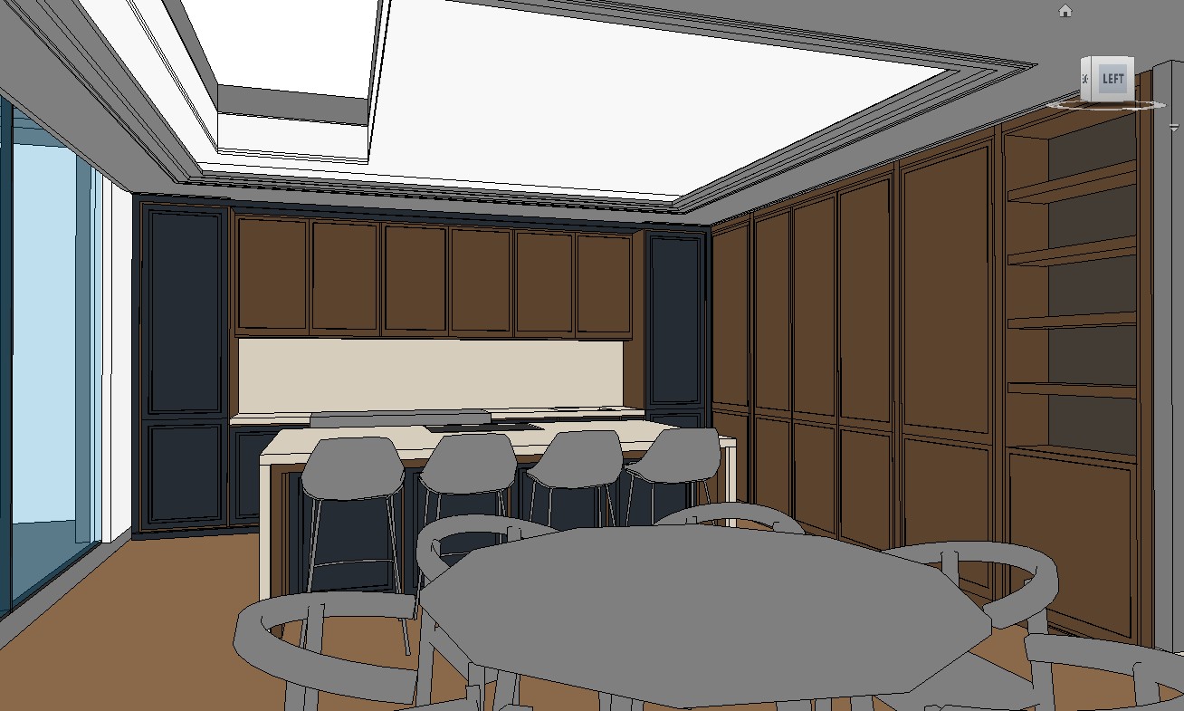 transform the provided image into a high end photorealistic render with a bright sunny daytime atmosphere the design and layout must remain exactly the same with no changes to geometry proportions or object positions all walls openings ceiling and skylight coving cabinetry island shelving table and chairs floor pattern and glazing must stay unchanged with nothing moved added removed or resized the glazing on the left hand side must clearly show direct sunlight and an exterior scene consisting of an external boundary wall a patio with an outdoor kitchen directly in front all located beneath a metal fluted canopy with strong natural daylight entering the interior and casting realistic sun patches and soft directional shadows across floors cabinetry and the island all cabinetry on the right hand side must remain entirely timber finished rendered in a light contemporary walnut with a matt surface and refined natural wood grain any painted cabinetry elsewhere should be finished in a deeper darker blue tone expressed as a contemporary interpretation of traditional panelled joinery with all panel proportions door sizes and detailing kept exactly as modelled and with timber accents retained around edges and junctions where indicated in the image the kitchen worktops and the backsplash behind the rear counter must be finished in a light marble with subtle veining realistic edge detailing and soft daylight reflections and the island must match this same light marble finish while retaining its exact form the induction hob on the kitchen island must remain exactly as indicated the aga on the back counter to the left must stay in its existing position and the sink with brushed brass taps must remain at the rear all rendered with accurate materials scale and detailing the kitchen should appear fully detailed and realistically lived in with appropriate everyday styling and material variation while maintaining all previously stated design constraints lighting must rely on natural daylight supported only by soft indirect artificial lighting in concealed locations with all direct lights removed to achieve a calm refined and contemporary residential kitchen that feels bright usable and authentic