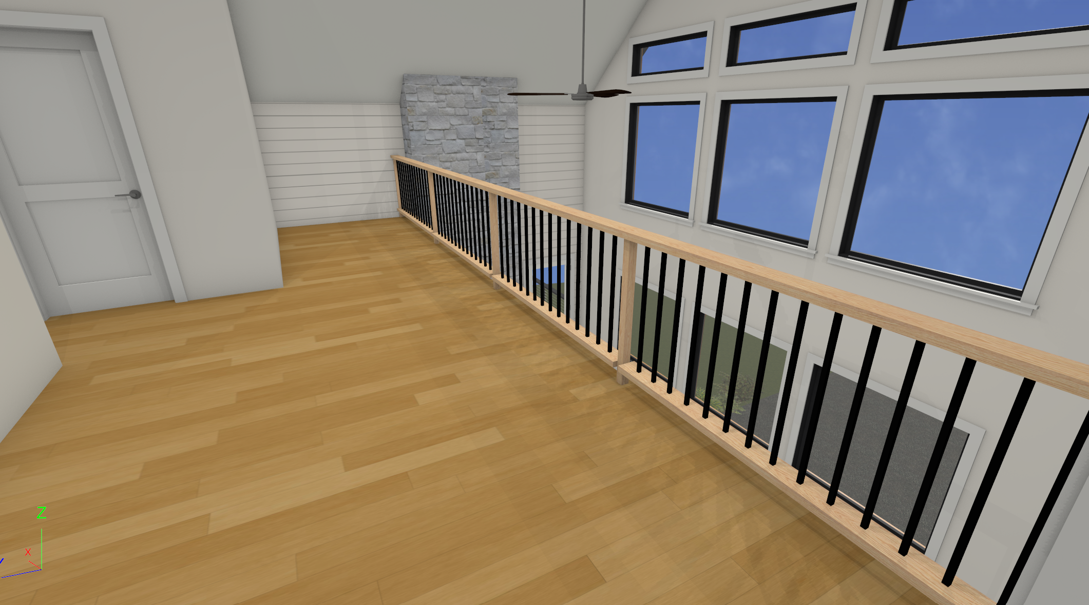 furnish this loft with transitional decor make the view out the windows many mature trees and a lake across the street