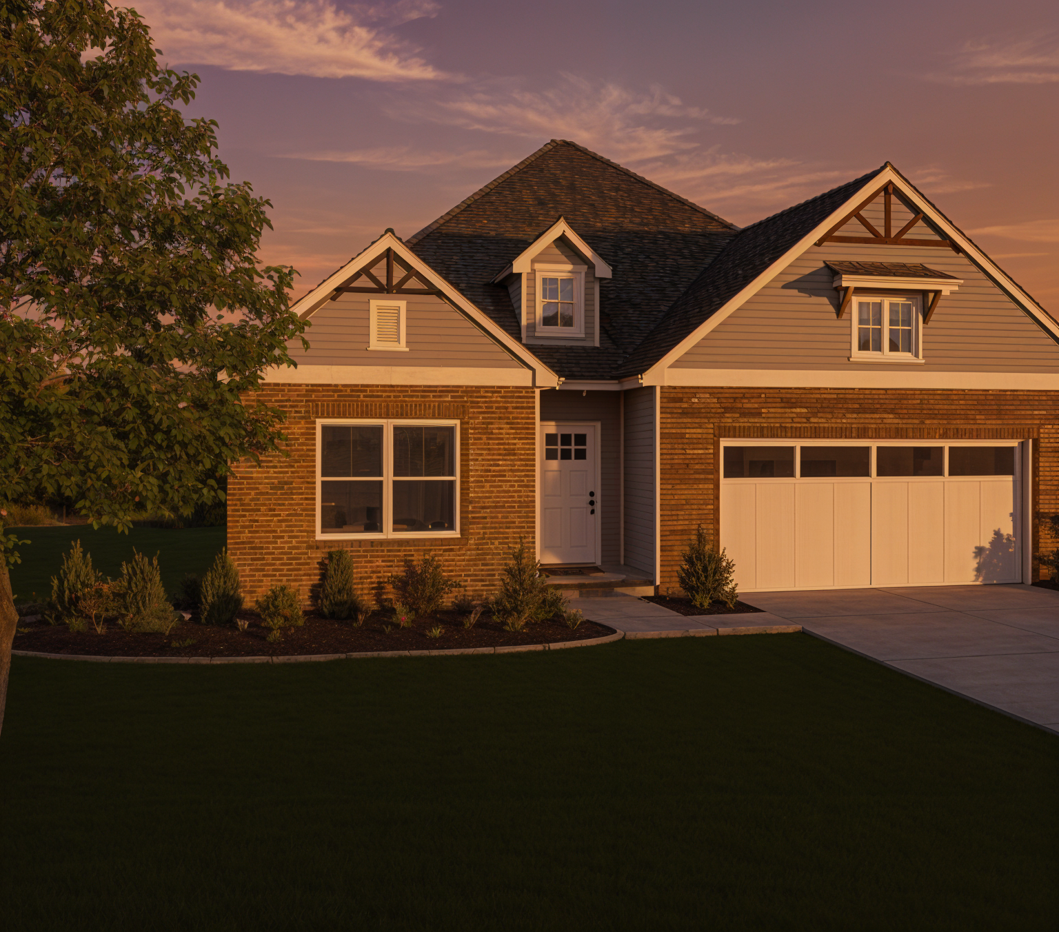remove grids from all windows shift camera angle back closer to road to center house in middle of frame