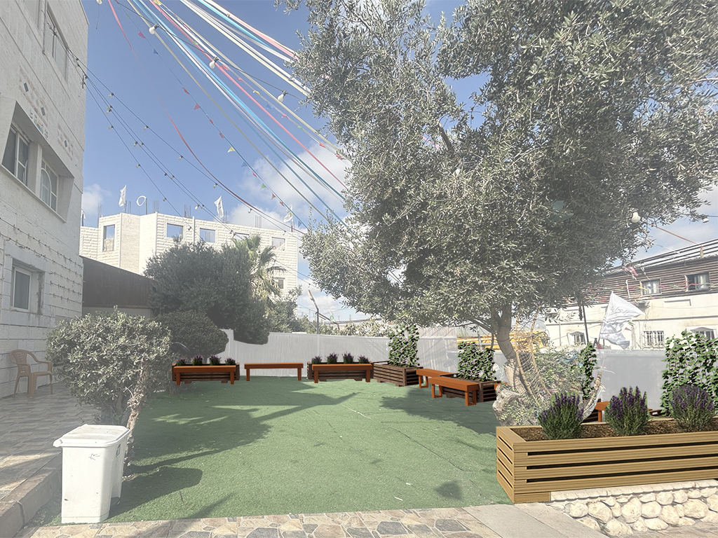 exterior shot fence wood coated with a white transparent paint still showing the grain planters natural wood color containing herbs and climbers as in your 3d model benches all orange wood placed both between and in front of the planters forming that full u shape line along the back layout exactly as in your design reference no spacing or rhythm changes architecture