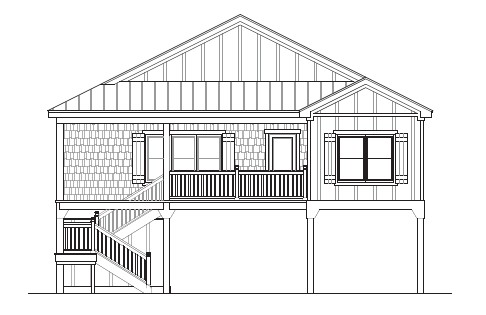 light gray shake siding under porch with all white trim light gray board and batten siding with all white trim black windows dark metal roofing open parking under with drive way palm tree background architecture