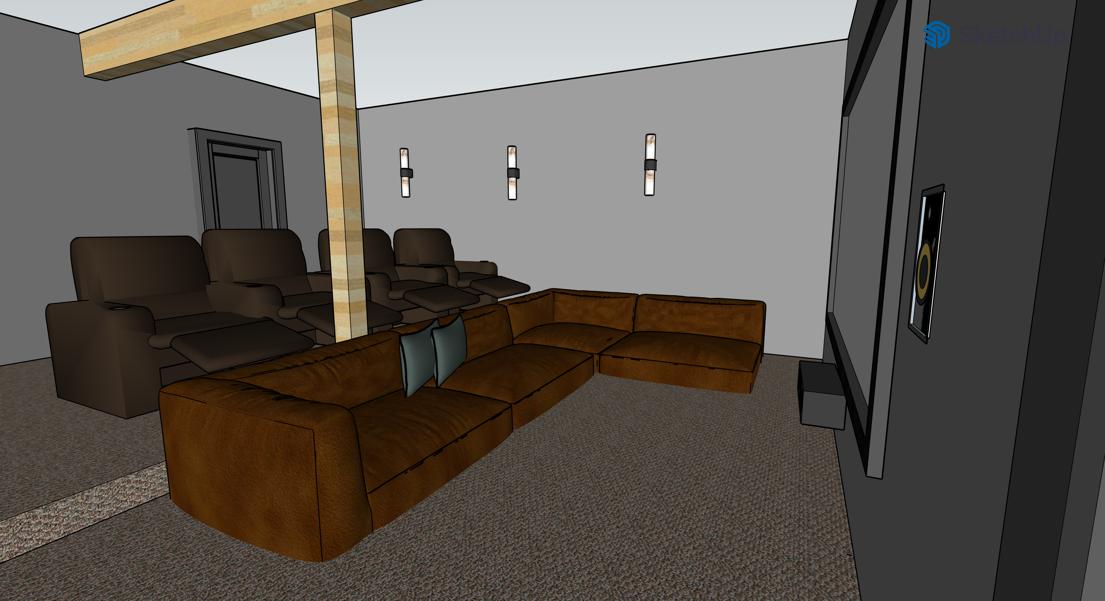 sectional sofa and theater seating are in same dark brown suede fabric add a beige fur blanket and soft grey textured throw pillows to the sectional sofa walls are upholstered in a dark grey linen material floor is a soft warm berber carpet illuminate wall sconces in a warm glow add ceiling and 4 recessed can lighting overall feeling rustic cozy luxurious