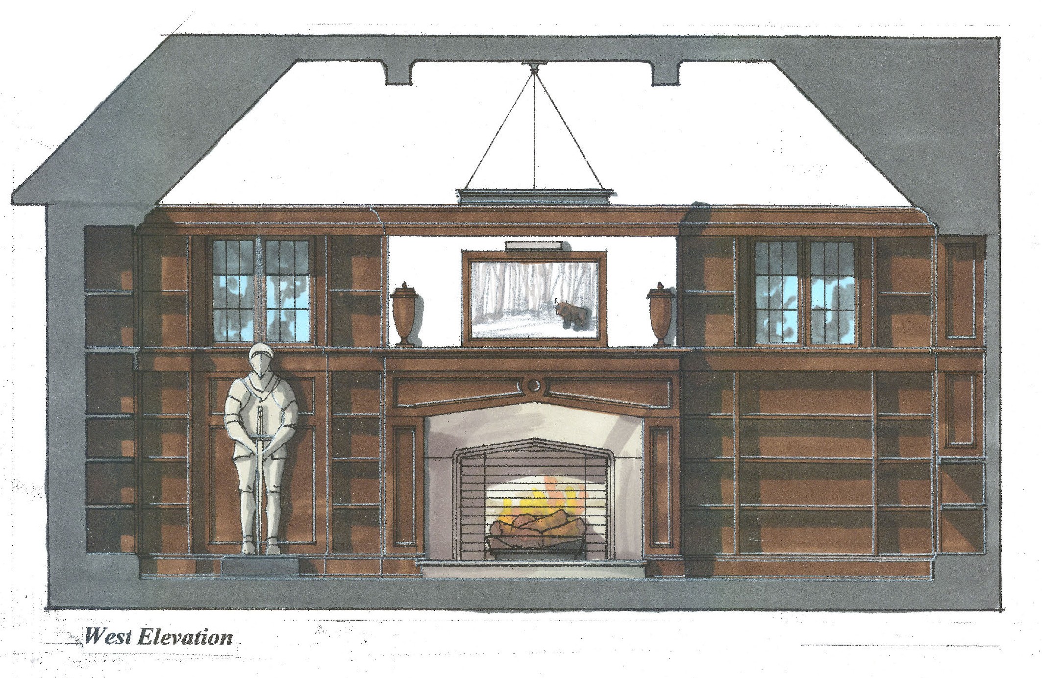 mahogony built in shelves cast stone fireplace surround chandelier show items on shelves the fireplace sits on a cast stone hearth the space above the wood mantle is drywall the space between the fireplace opening and wood surround is cast stone