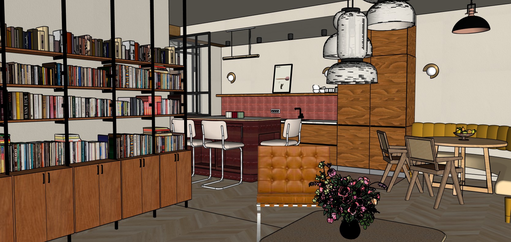 photo realistic living room and kitchen respect proportion natural light from the window and soft and warm light from the lamps on the wall and the seilling