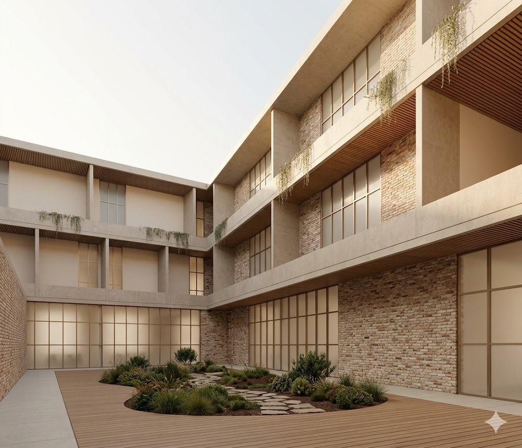 ultra realistic architectural render based strictly on the provided line drawing keep exact geometry proportions and perspective do not modify the design interior courtyard symmetrical composition eye level camera 24 28mm lens strong vanishing point materials all fa ades in exposed brick beige reddish tones visible joints natural imperfections ground floor dividing walls also in exposed brick upper parapets in polished concrete light beige gray smooth ceilings soffits in wpc wood slats warm tone floors in natural wood deck matte finish narrow concrete sidewalk along building edges windows frosted opaque glass thin satin bronze frames no interior visibility vegetation light hanging plants from upper levels not dense central sensory garden with organic shape natural soil stone paths low grasses small shrubs balanced not crowded interior walls smooth warm white beige paint lighting soft natural daylight morning or golden hour warm light soft shadows realistic bounce style photorealistic clean minimal no saturation no cgi look no extra elements no furniture