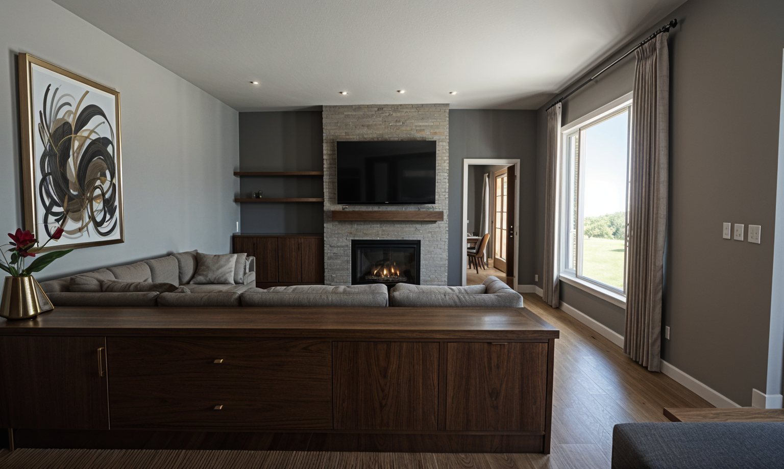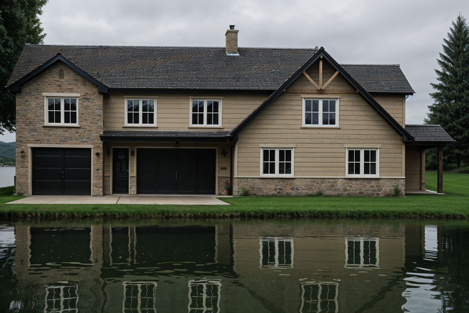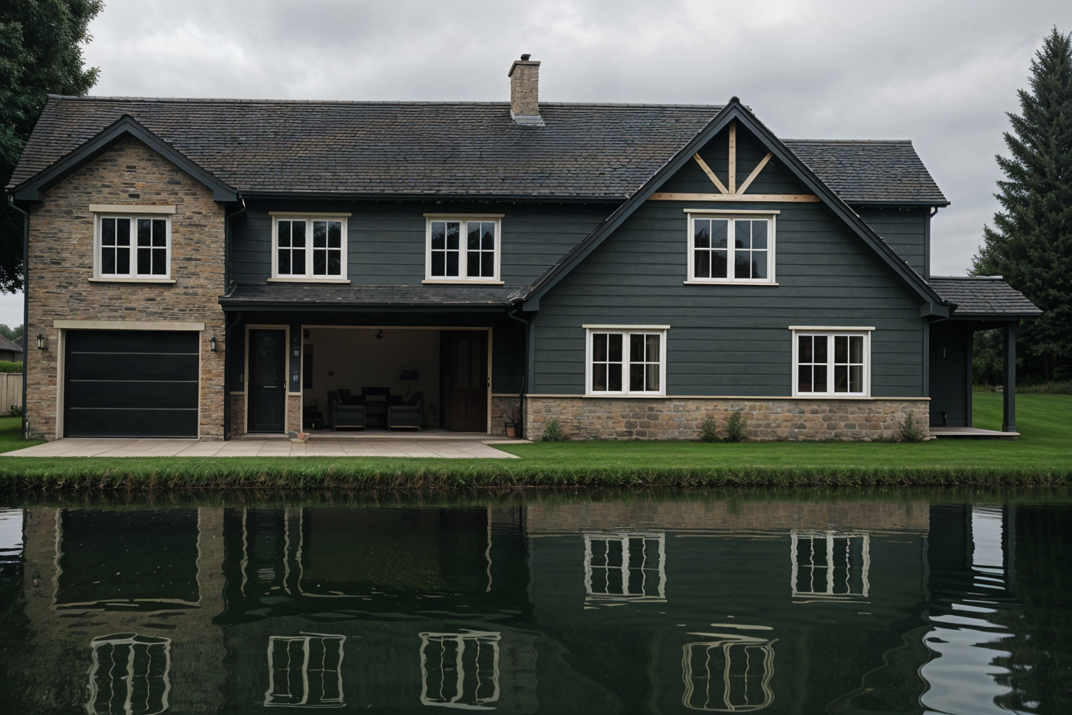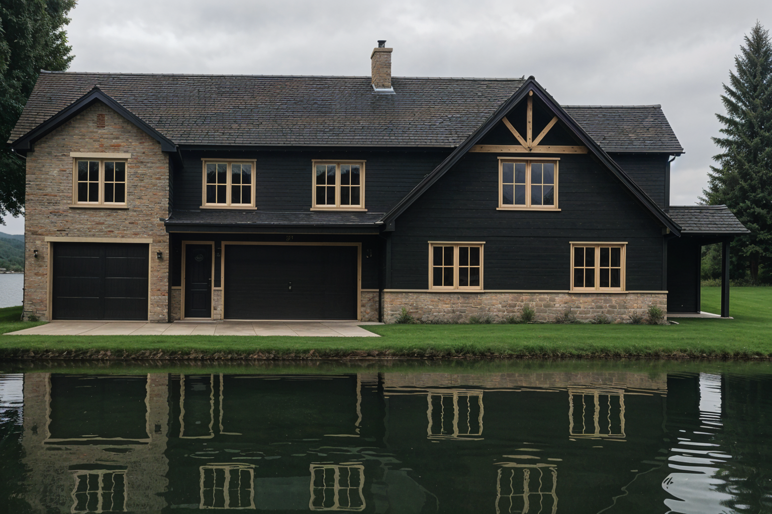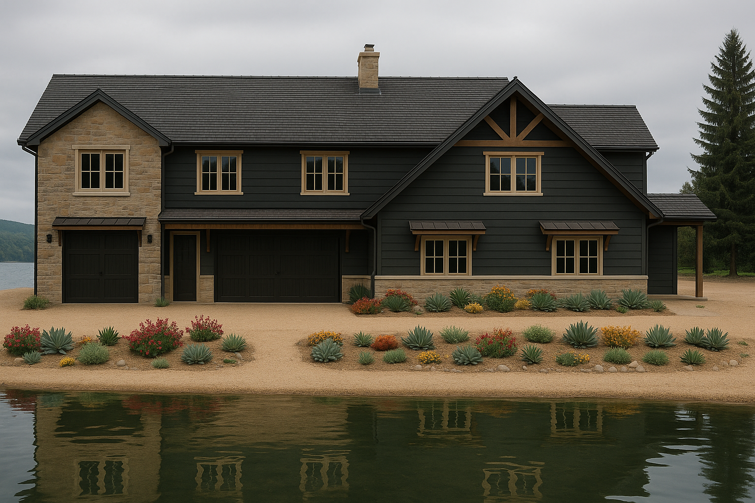 change it to white siding black window trim and gray stone
