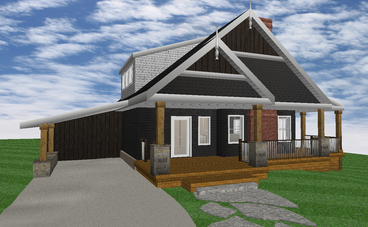 replace background with tree line and feild brighten up light the changee chiminey to reclaimed red brick carport