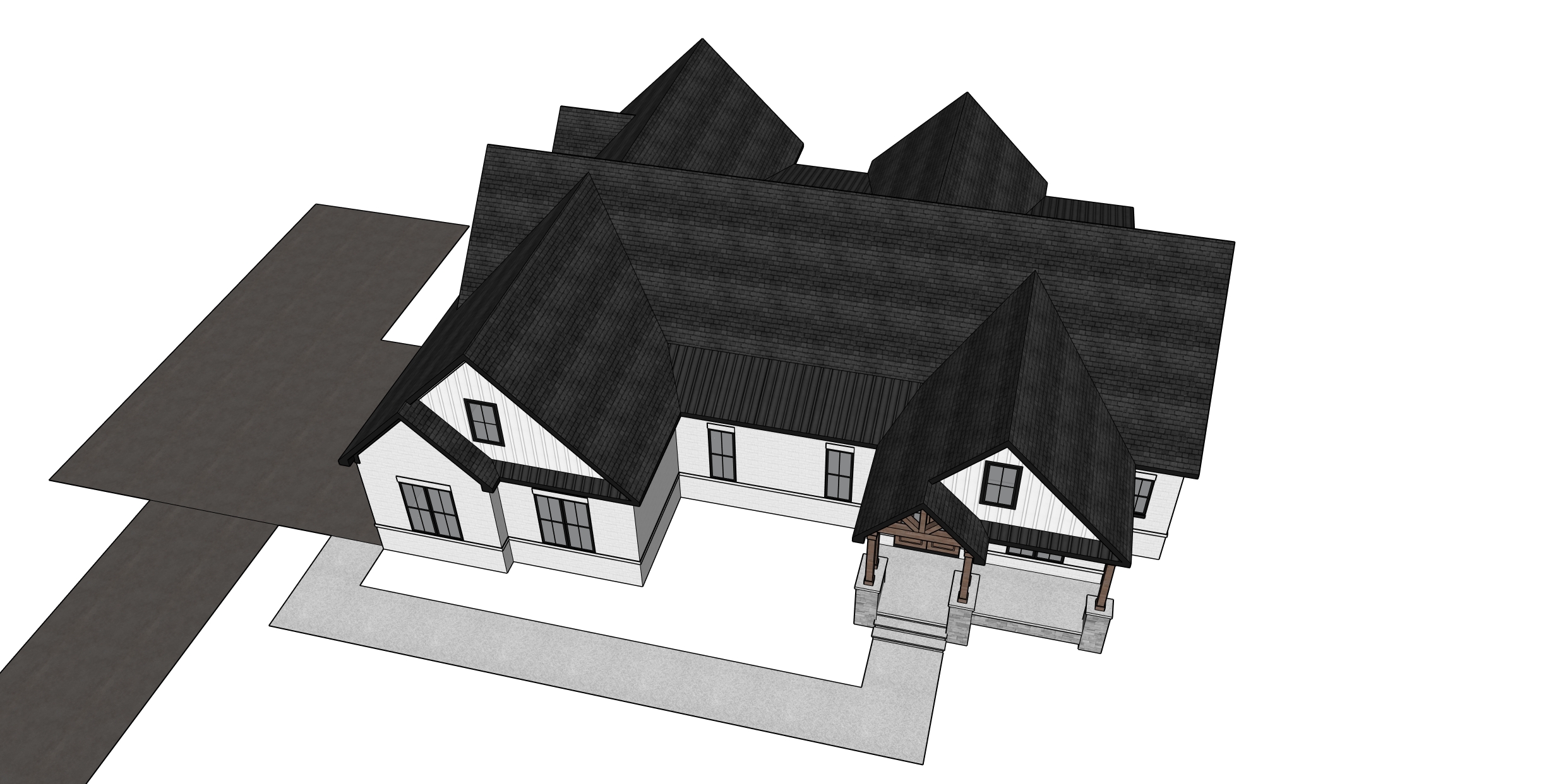 maintain materials make realistic add landscaping add trees around house stone is only on porch white board and batt siding only up in closed off gables black gutters birds eye view looking down