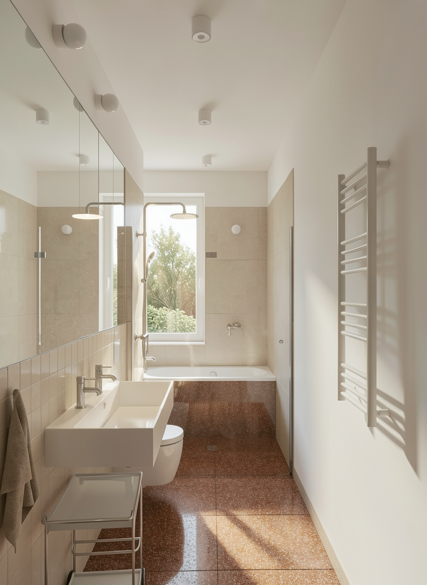 tile floor matte semi gloss against wood floor with brass schluter to separate floors blue velvet chairs in the center and cream leather chairs along booth stucco cream walls back light letter for the iccara letters on the wall light chandeliers brighten room wine display in glass cabinet next to arch opening add soft glow in the arches with the pottery