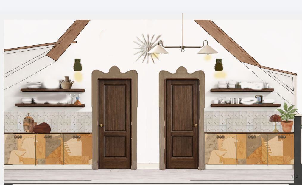 limestone flloor unicolored beige doorframe deep green wall light just few nice stuff on the shelves
