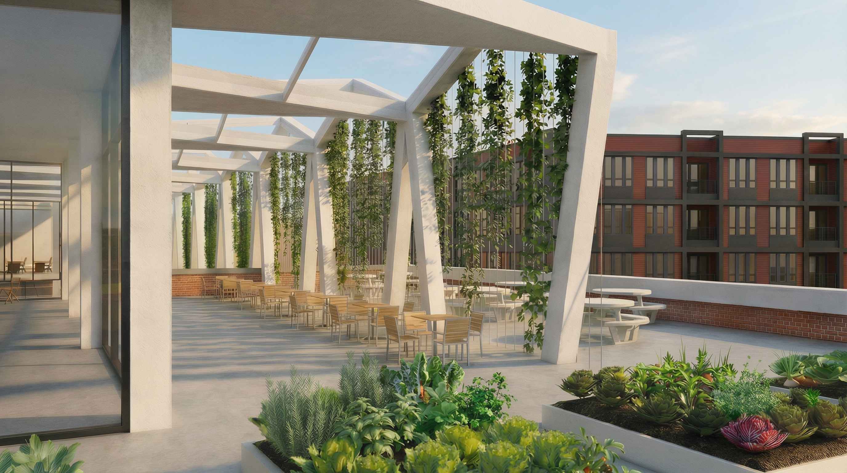 do not change any architecture materials vegetation layout or lighting remove the global haze fog or soft blur covering the entire image and restore clear crisp realism sharpen the scene very gently and evenly no added noise no diffusion filter no glow maintain the same colors and exposure do not soften stylize or apply depth of field the image must remain fully sharp from foreground to background preserve all existing concrete textures vines tables chairs plants and the building in the distance exactly as they are only remove the unintended haze and restore clarity
