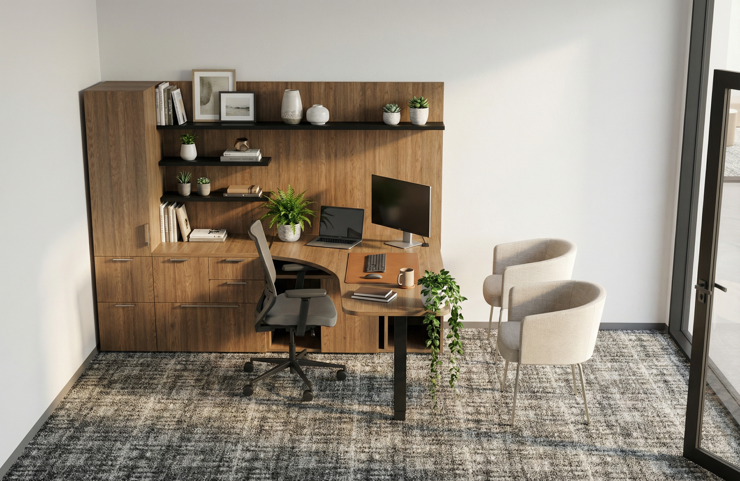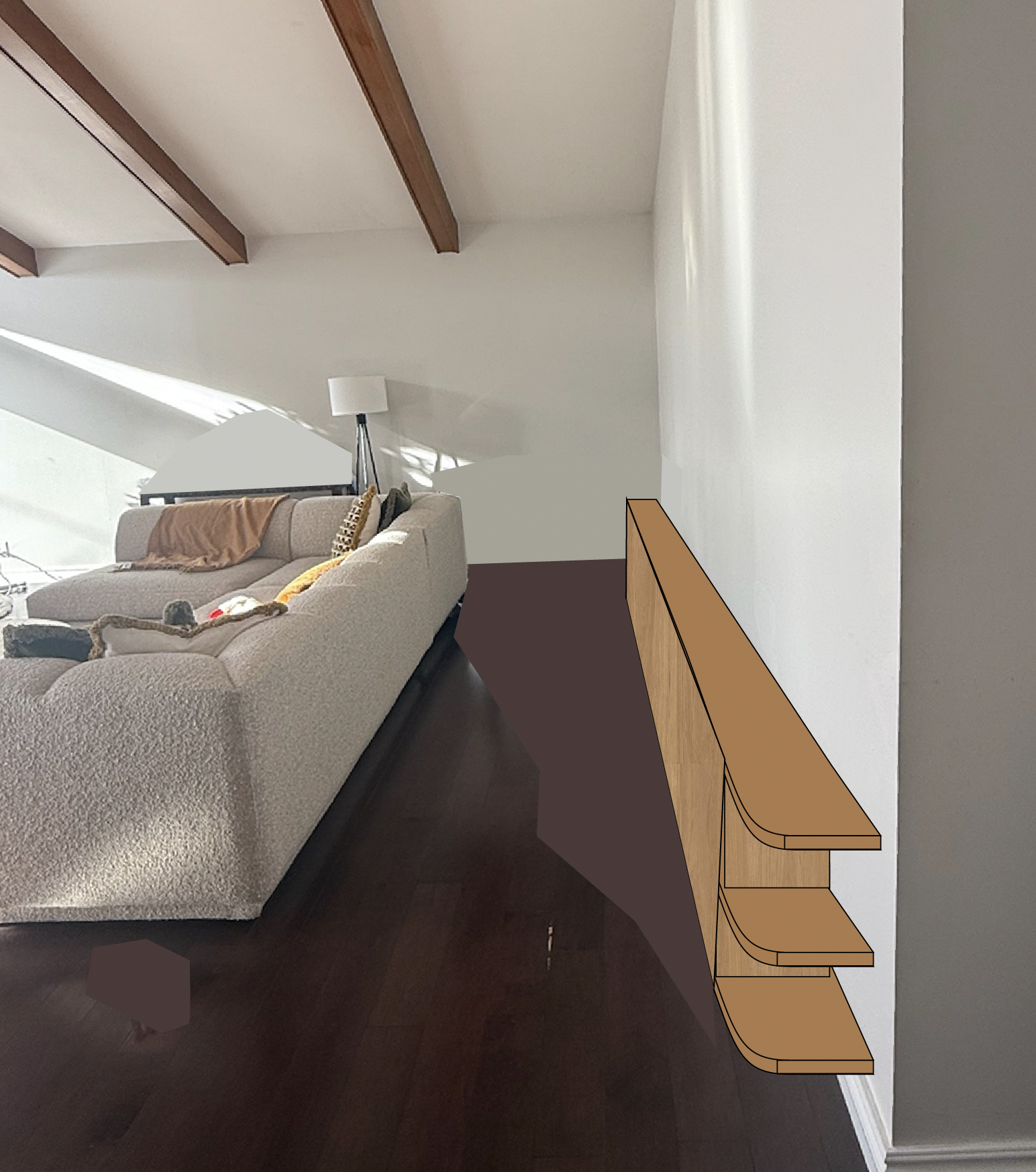 draw this side profile of a wall shelving system as one walks into this space with rounded corners on the bottom shelves in a light colored wood use second