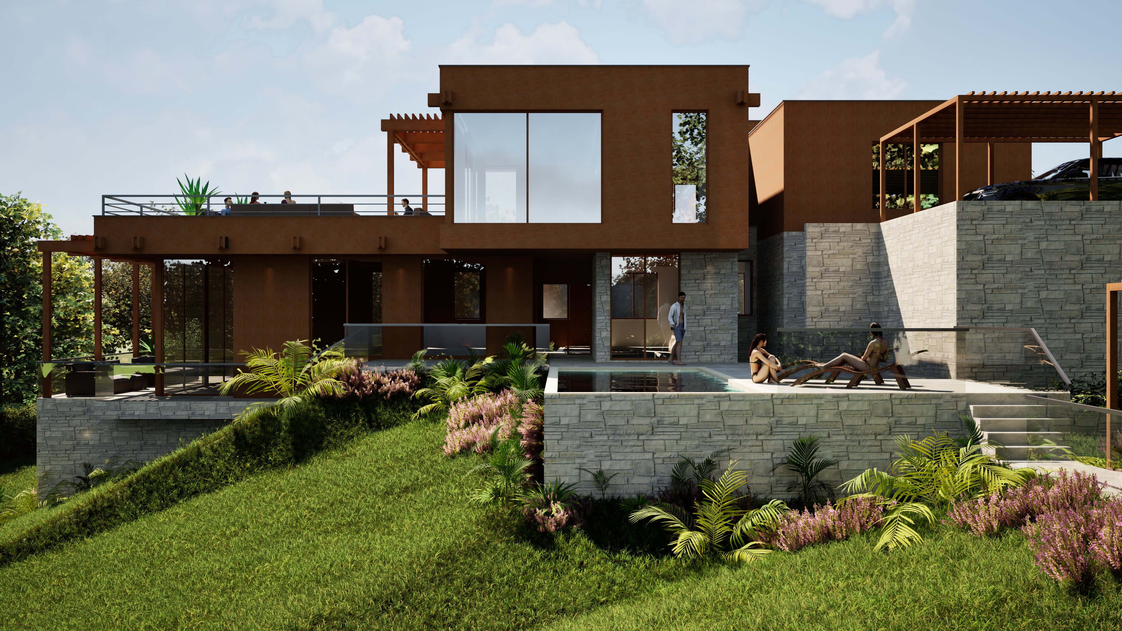 high tech exterior shot green surounding phasade is stones and first floor is wooden vertical planks architecture