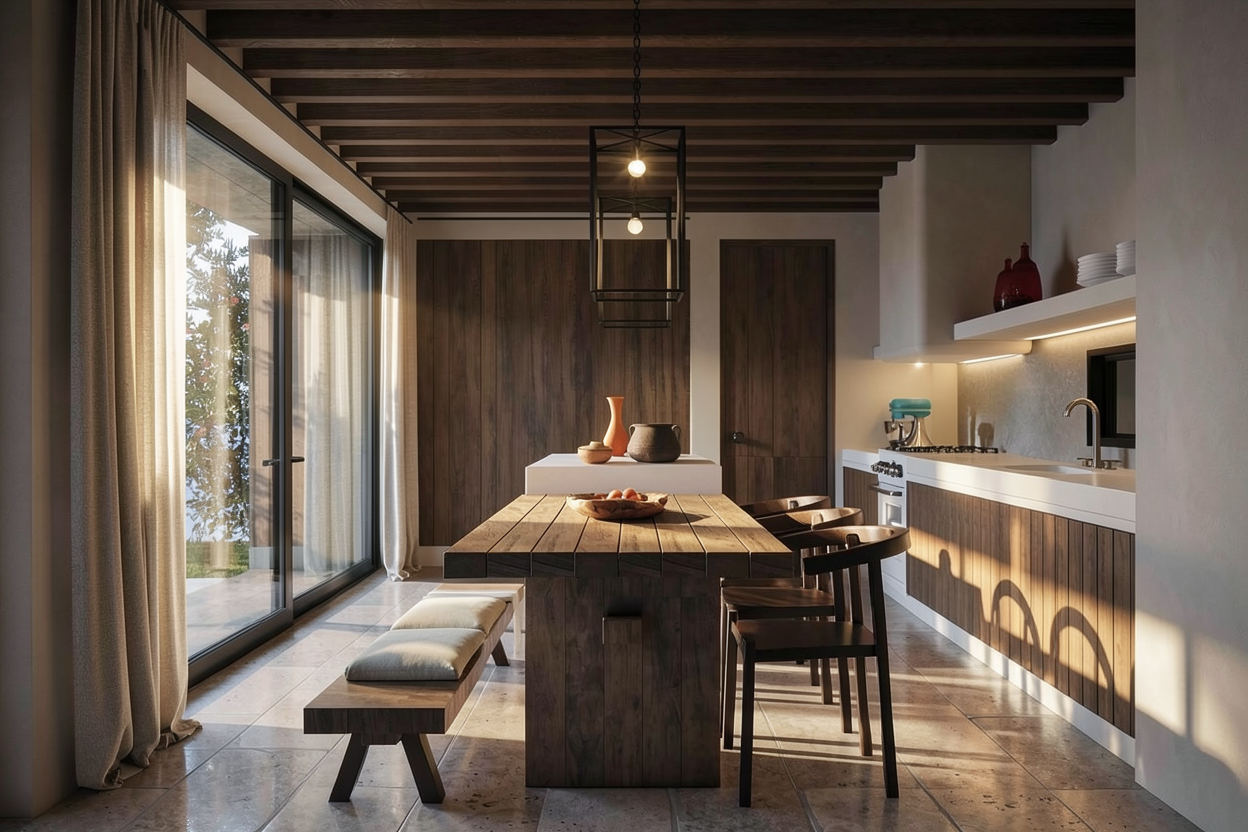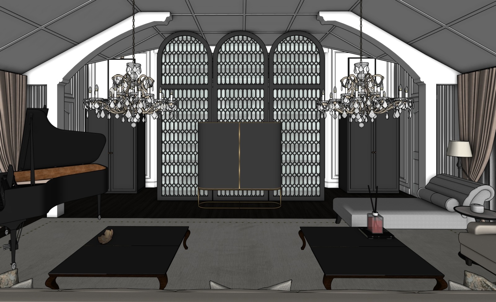 maintain the exact architectural geometry room proportions ceiling height wall positions openings and structural elements of the sketchup model do not alter architecture or layout only adjust materials lighting furniture styling and decorative elements to recreate the same mood elegance and balance as the reference image while incorporating the serene understated luxury characteristic of aman interiors overall design direction create an interior that blends refined european elegance aman style minimalism calm luxury hospitality atmosphere symmetrical architectural composition warm layered lighting the final environment should feel like a private lounge inside an aman resort residence or aman club atmosphere keywords quiet luxury serene timeless architectural calm warm elegance avoid anything overly decorative or ostentatious colour palette primary tones warm ivory plaster walls soft sand beige textiles dark walnut wood bronze or brushed brass metal accents crystal glass lighting accent tones burnt orange or terracotta velvet seating subtle stone neutrals colour palette should feel earthy warm and restrained lighting concept lighting must create aman style calm atmosphere with chandelier elegance main feature large classical crystal chandeliers aligned symmetrically lighting characteristics candle style bulbs 2700k warm light sparkling crystal reflections soft warm glow across the room layered ambient lighting subtle wall wash lighting supplement with hidden ceiling coves or indirect lighting soft floor reflections gentle shadow gradients avoid strong spotlighting lighting should feel warm soft luxurious calming walls architectural surfaces walls finished with warm ivory lime plaster or matte paint subtle classical panel mouldings clean elegant detailing surfaces should feel refined yet quiet consistent with aman philosophy feature screen backdrop central architectural screen with arched openings and decorative metal lattice panels material direction dark bronze or gunmetal metal subtle geometric lattice pattern soft metallic sheen layered depth behind panels this element should appear elegant but restrained flooring use dark walnut timber flooring or rich dark wood tone add a large natural woven rug in soft neutral colour to anchor the seating area textures should feel natural warm quietly luxurious furniture furniture should be transitional luxury with aman restraint sofa light cream or sand upholstery clean modern lines deep comfortable seating accent chairs burnt orange velvet classic curved arms dark timber frame coffee tables dark walnut wood low elegant profile side tables marble or stone top slim metal base console centerpiece dark wood cabinet brushed brass frame minimalist proportions refined craftsmanship furniture must feel balanced comfortable luxurious yet understated materials use authentic luxury materials walnut timber bronze metal crystal glass velvet upholstery woven natural fibre rug metal lattice screen textures must be subtle tactile and photorealistic decorative styling keep styling minimal and curated consistent with aman interiors suggested elements sculptural decor object elegant candle minimal books or trays subtle artisan pieces avoid clutter objects should feel intentional and calm photorealistic rendering quality render must be high end architectural visualization quality requirements physically accurate global illumination crystal reflections from chandeliers soft shadow transitions realistic material roughness balanced exposure natural reflections on wood and metal avoid overexposed highlights strong hdr effects artificial glow camera composition use architectural photography composition lens 35 40mm equivalent camera placement eye level centered symmetrical view aligned with central console and chandelier axis maintain perfectly vertical lines composition should emphasize symmetry depth luxury lighting final mood the final render should evoke the atmosphere of aman resorts refined london private residences high end boutique hospitality lounges mood should communicate calm luxury timeless elegance architectural serenity warm evening ambiance