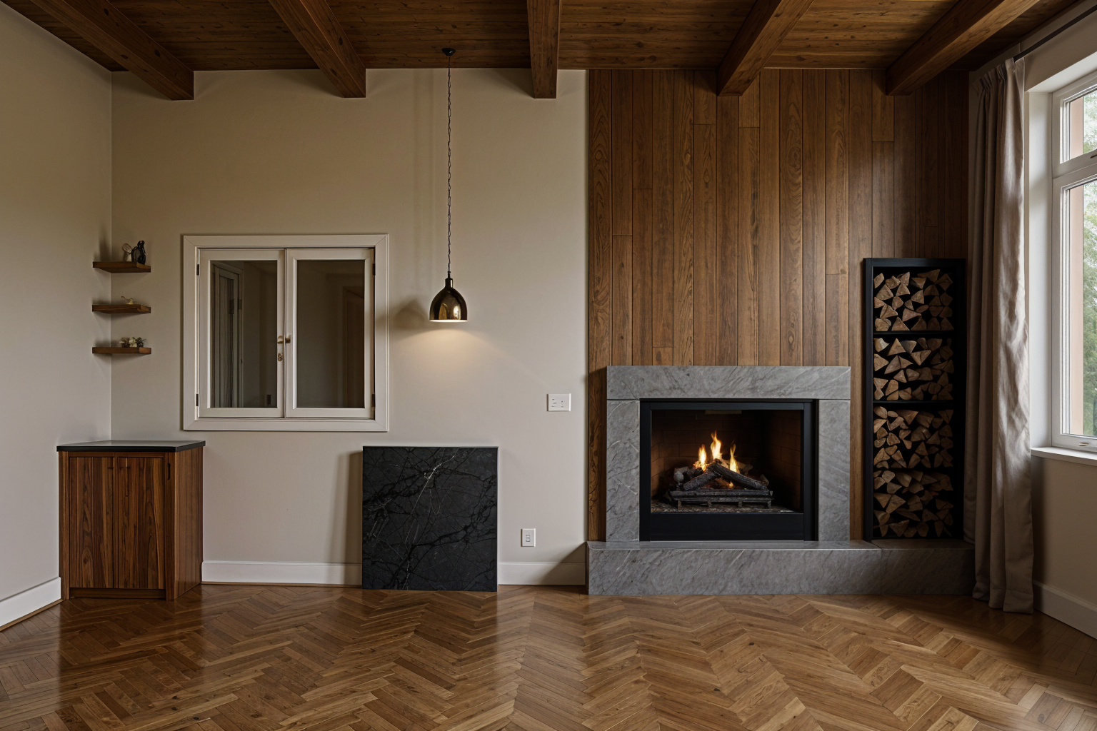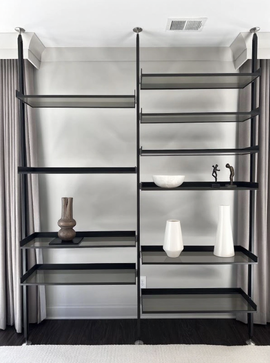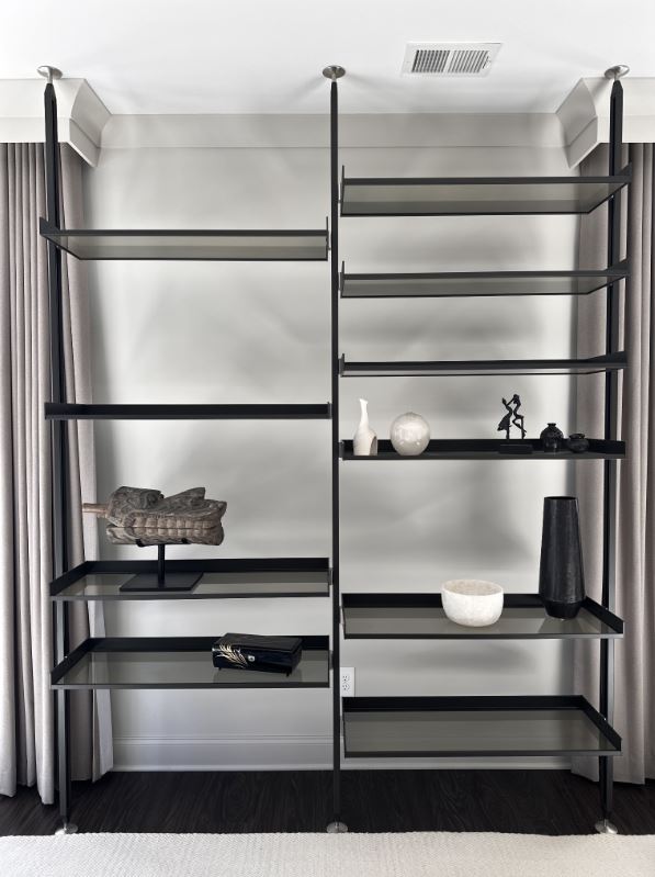 create a beautifully rendered scene of modern minimalist shelves against a soft gray wall use sleek black for the metal frames and floating shelves creating contrast with the subtle white and beige vases and small black sculptures arrange an elegant woven basket with natural tones on the lower left shelves incorporate warm diffused lighting to enhance a calm sophisticated atmosphere the background should include elegant floor to ceiling curtains in a muted taupe shade and a plush cream carpet adds to the serenity of the space