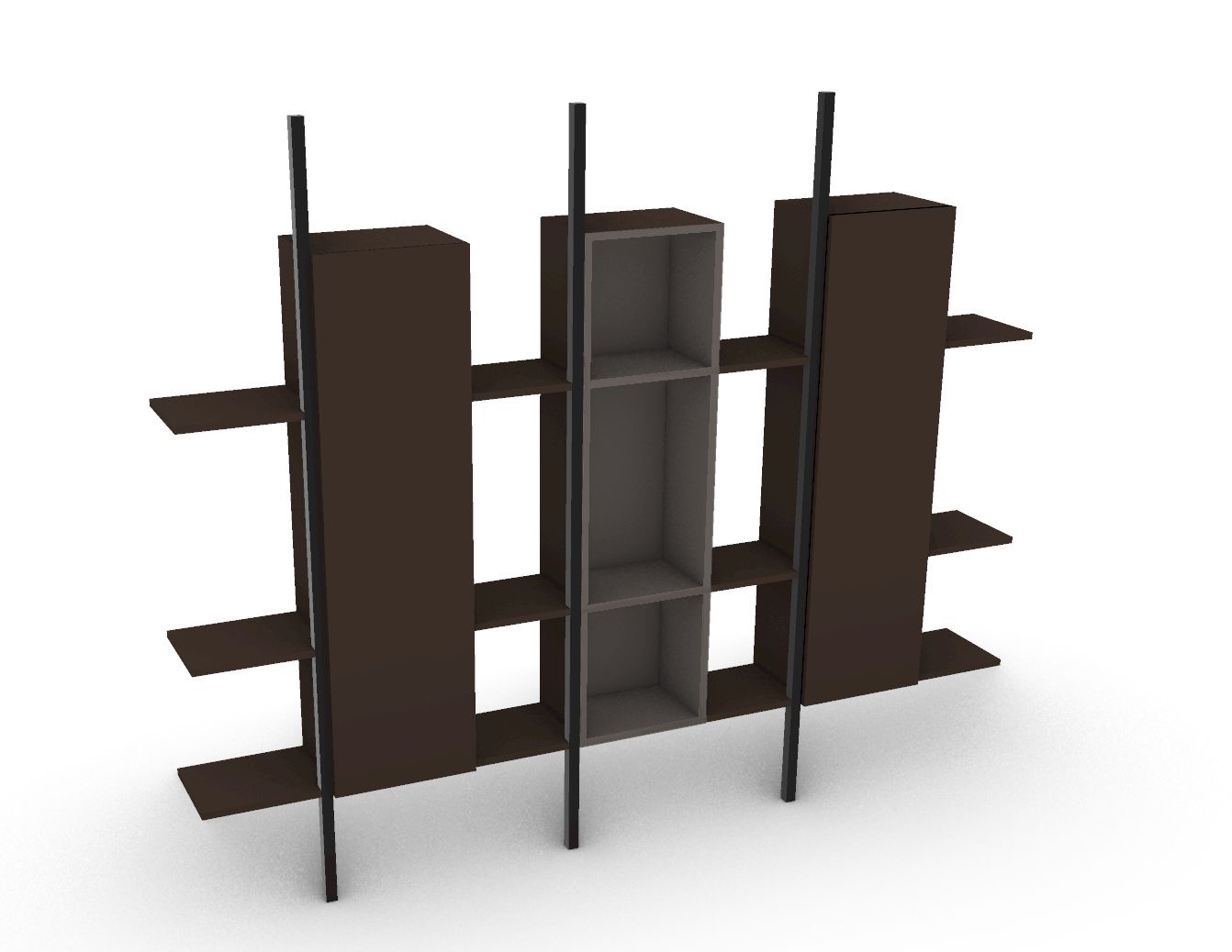 place this bookshelf in a room of a modern but simple living room the dark parts are made of walnut wood the shelves are only three the wardrobe in the center has a wooden structure like the others but has a glass door and inside it you can see the two doors that pass through and the vertical supports are only three and they must be the same as the drawing