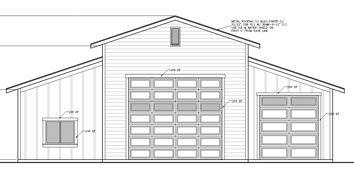 render this garage add a driveway in front of the roll up doors black fascia and trim the siding should be white and the garage doors a dark grey with no windows in them the siding on the main central element is horizontal and the sides are board and batten with a 24 spacing do not make any other changes