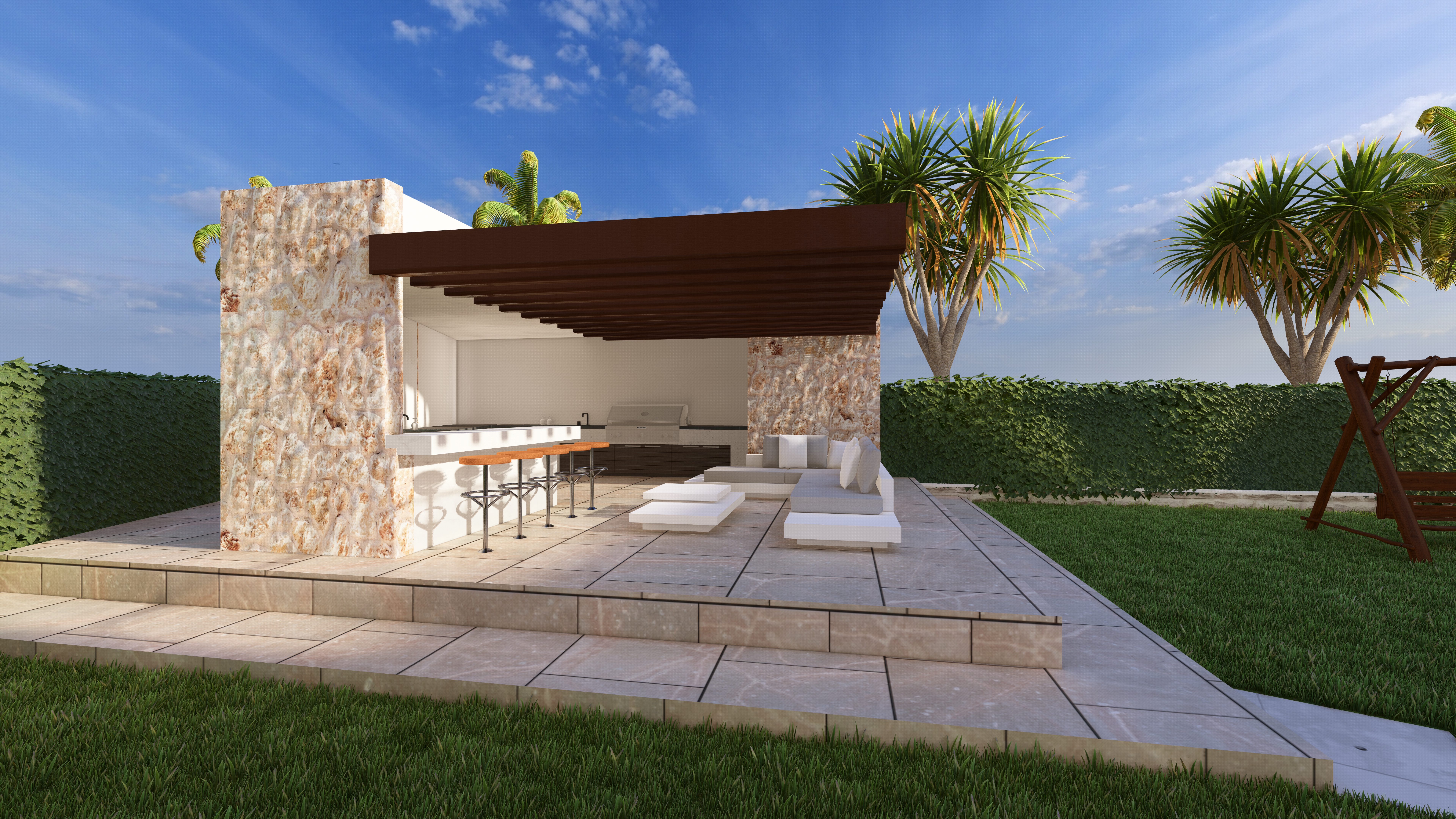 add some room lighting make the white walls crisp whille maintaining the natural stone texture of the other walls please make as photorealistic as possible add depth as well add indoor warm lighting and maintain texture and colour of surfaces scene should be daytime add a bit of clouds to the scene add some warmth yellow tint to the scene just a bit