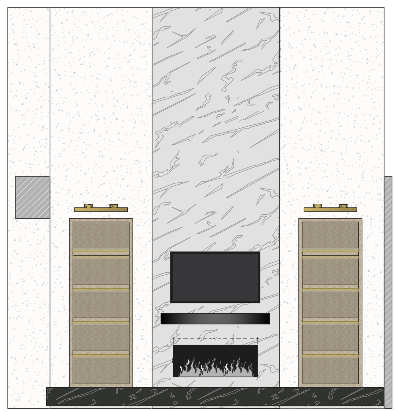 center fireplace surround in large porcelain sheets like marble drywall on each side with white oak book cases built into the drywall the bookcases are 18 deep but recess into the drywall 15 the dark bottom area is a black stone floating hearth light white oak floors