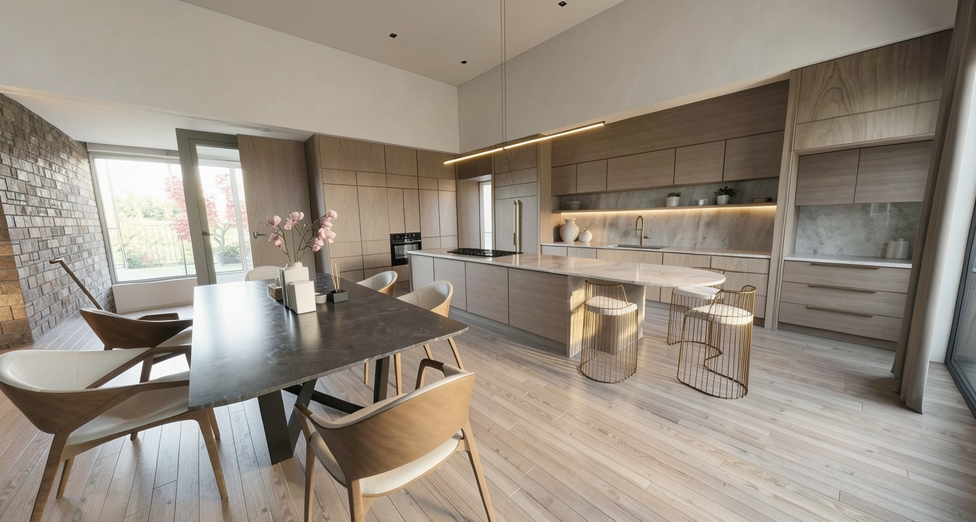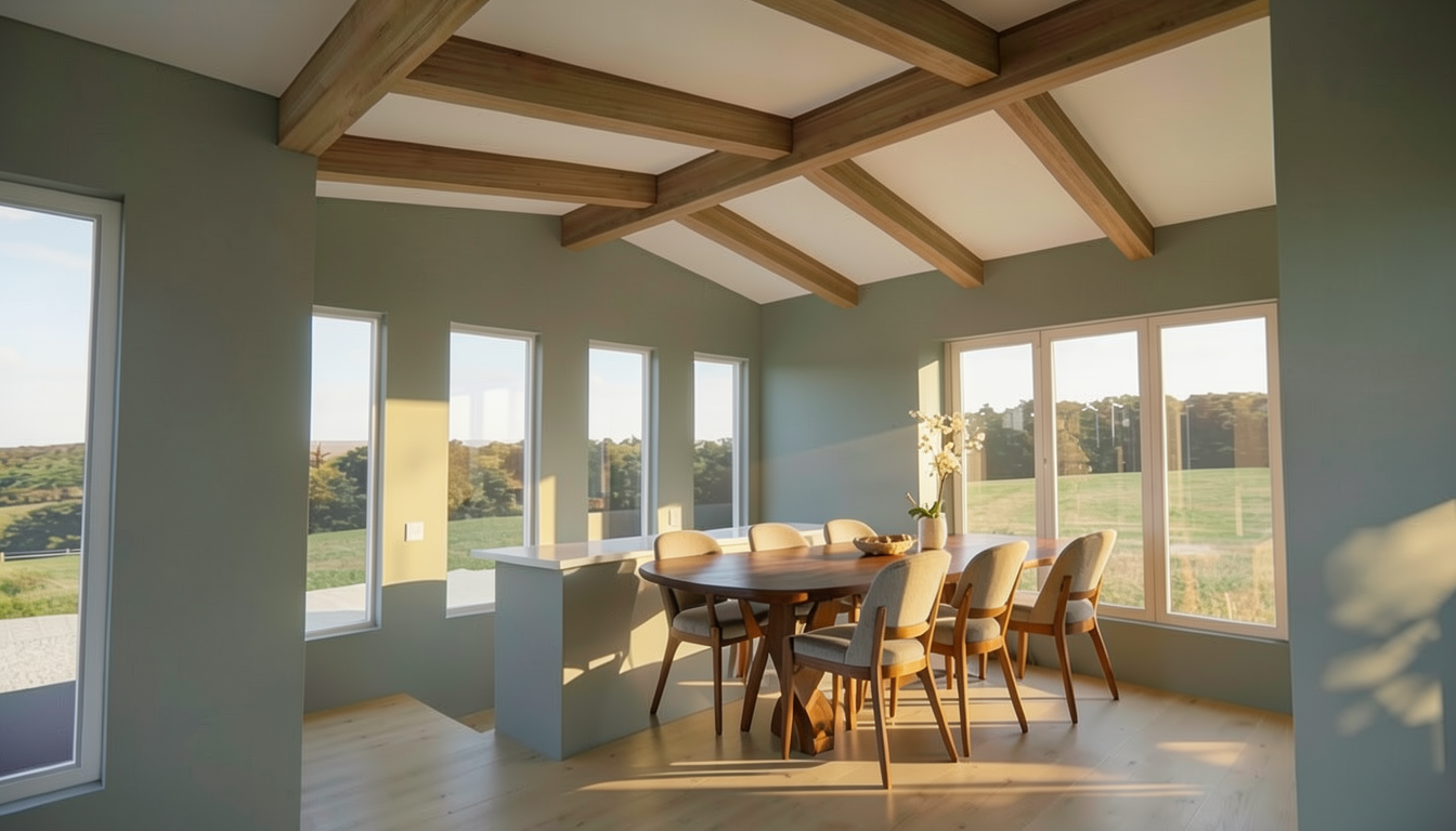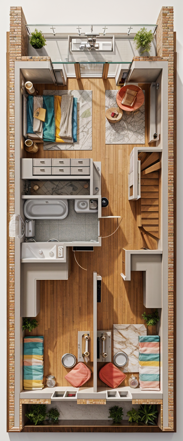 render the aerial view floor plan view of the cottage style studio apartment with an open floor plan use soft white walls and a light oak wood floor the kitchen features sleek stainless steel appliances and white marble countertops the living area has a plush neutral sofa with colorful accent pillows and two small distressed white wood side tables a 42 round wooden dining table is accompanied by 4 upholstered chairs on wheels create a cozy atmosphere with warm lighting the golf simulator space should have green grass turf with projection screen at the south wall white marble tile flooring white plumbing fixtures with golf faucets show wood flooring and neutral paint color continuing into closet spaces with no other details murphy bed should show fold out king bed with white bookcases on either side of the bed laundry room has white washer and dryer with millwork storage above and beside storage shelving in laundry room on south wall show white drapes with colorful patterns at all windows include a golf simulator area with bright green turf flooring surrounded by light gray netting hanging from the ceiling the murphy bed is folded against the wall next to white bookcases add a compact laundry room with stacked white washer and dryer units the bathroom features sleek white tiles and polished chrome fixtures overall ensure a minimalist and elegant design with natural light streaming in from large windows