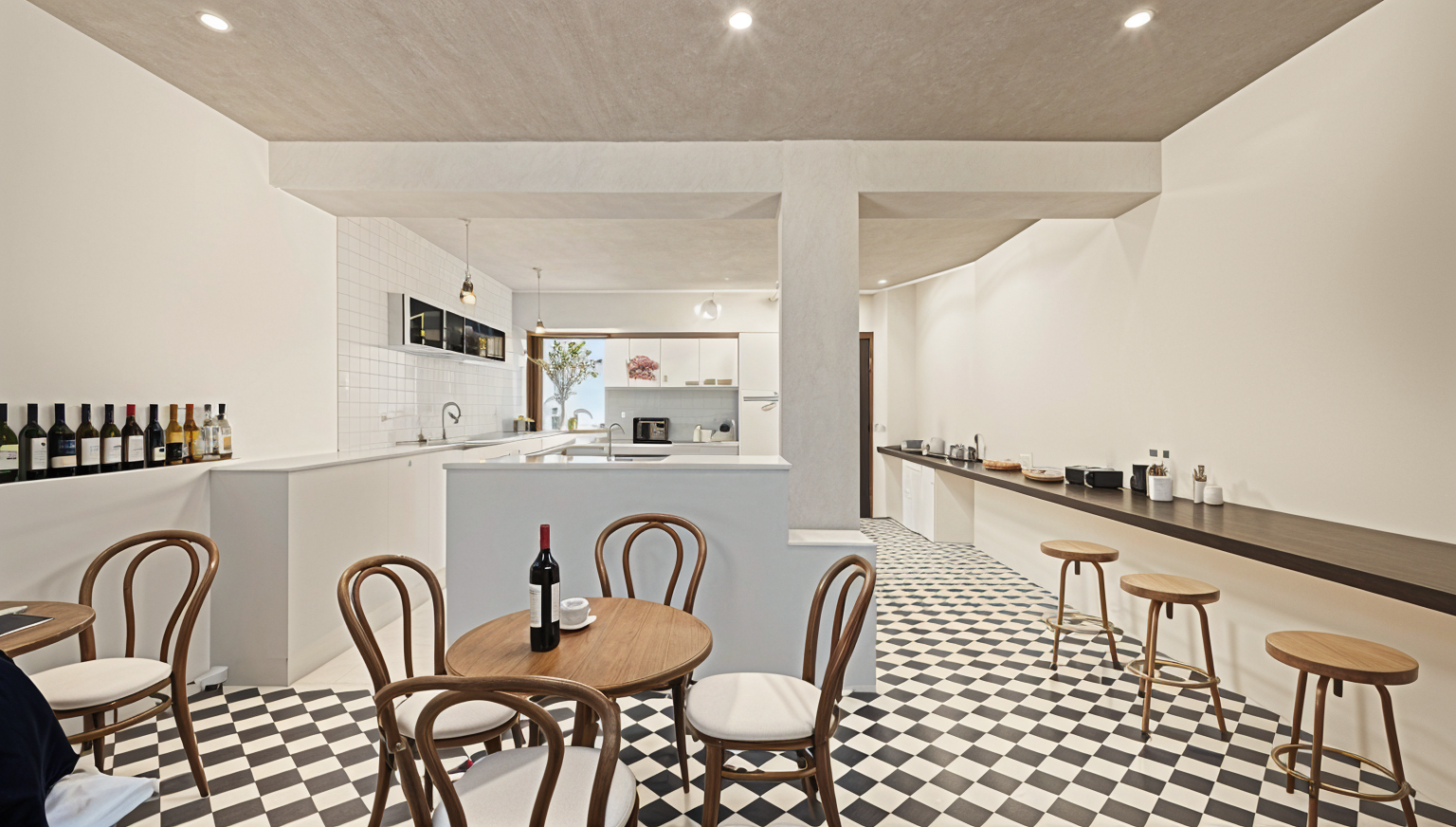 preserve all geometry lighting colors add an abstract painting on the right wall add 4 cups and a pitcher to the shelves on the left and a sink to the countertop to the left make the floor and ceiling hardwood boards running vertically medium brown in color
