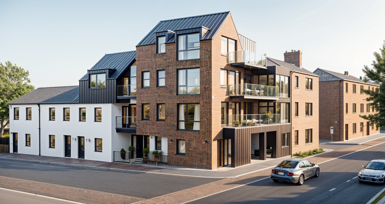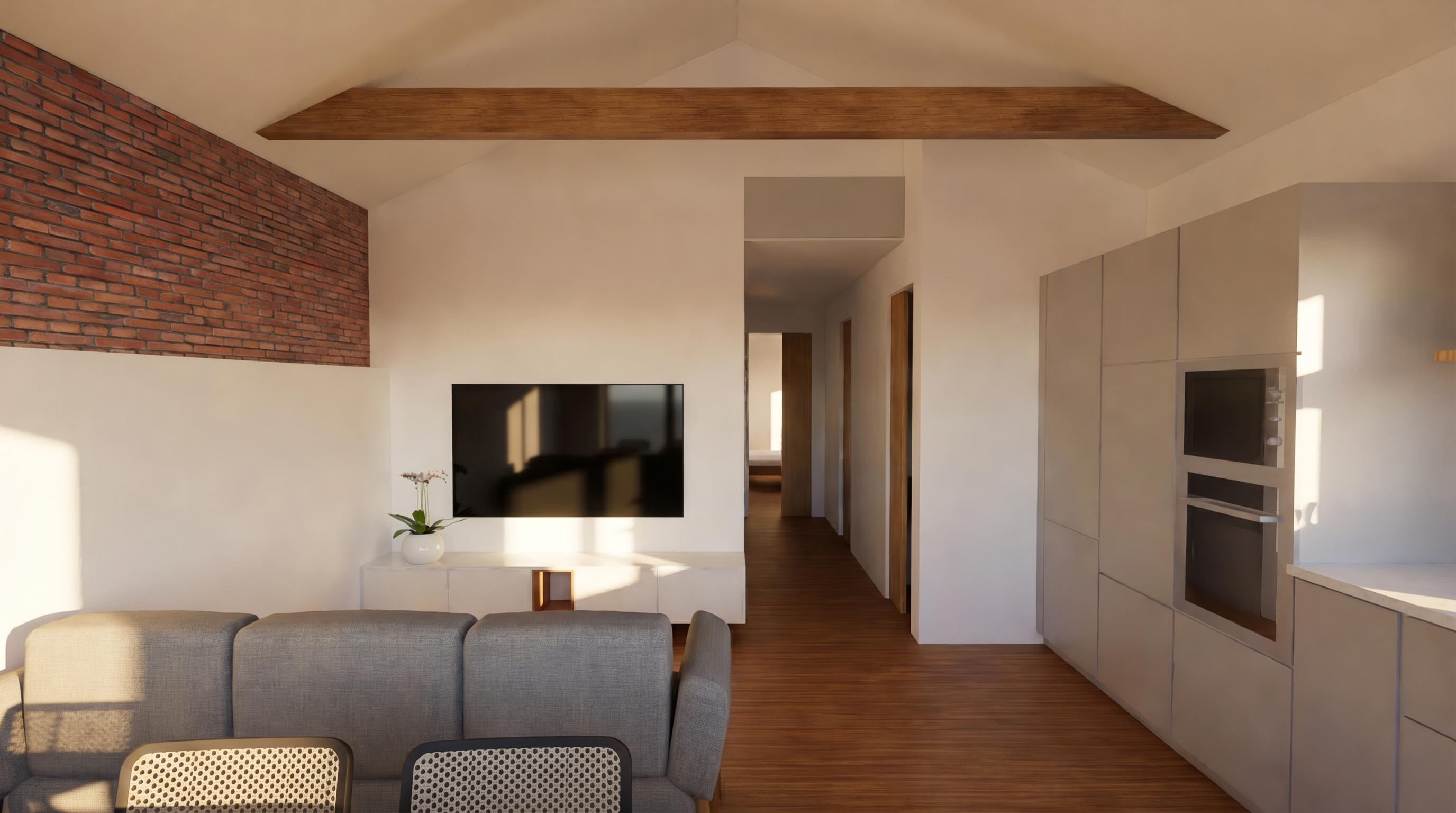 render a photorealistic modern kitchen interior with a cozy and inviting atmosphere features wooden cabinets in a dark gray with warm undertones with satin nickel cabinet hardware with a 3 inch wide by 12 inch height artic white picket undulated tile backsplash with snow white grout and countertops highlight the sleek stainless appliances and countertop to be dawn mist granite stainless steel undermount double bowl sink with a delta westville single handle pull down kitchen faucet in artic stainless walls in a soft grey e0e2e0 ceiling in a white f7f7f1 base board in a white f7f7f1 show molding in a white f7f7f1 doors in a white f7f7f1 door hardware to be a satin nickel add floor elmwood smoke lvt in a soft cool gray brown cast and a more weathered look than the warmer oak visuals add three one light pendants with a slender design that complements mid century modern transitional and contemporary settings with a simple round canopy suspended over a cylindrical clear glass shade over the island in matte black measures 4 in diameter by 9 75 in height use a warm ambient lighting in the can lights show use a soft ambient lighting to enhance the warm atmosphere color scheme