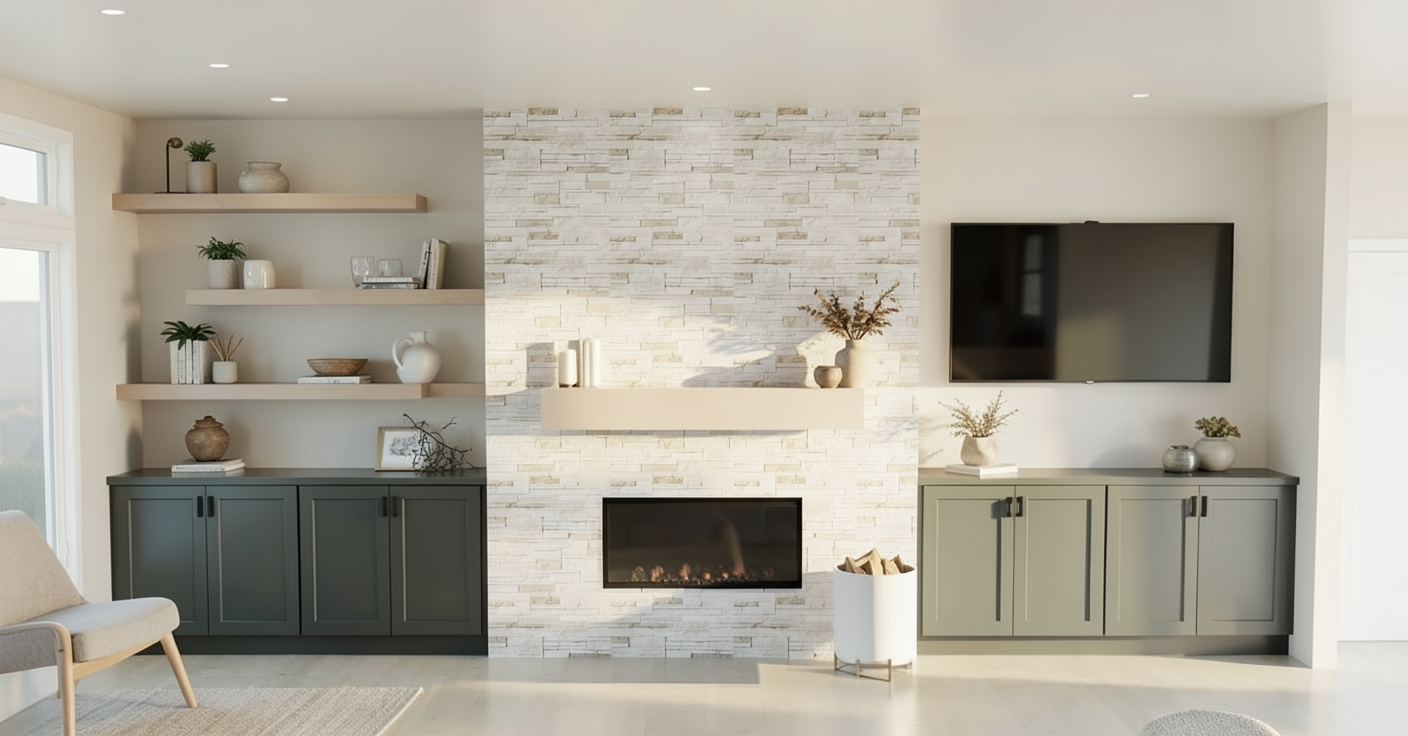 add decor to shelves and add minimal furniture make cabinets light black paint