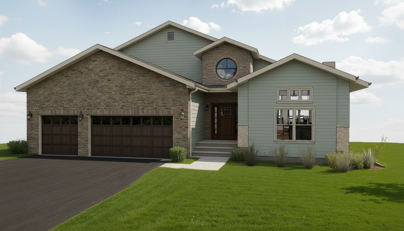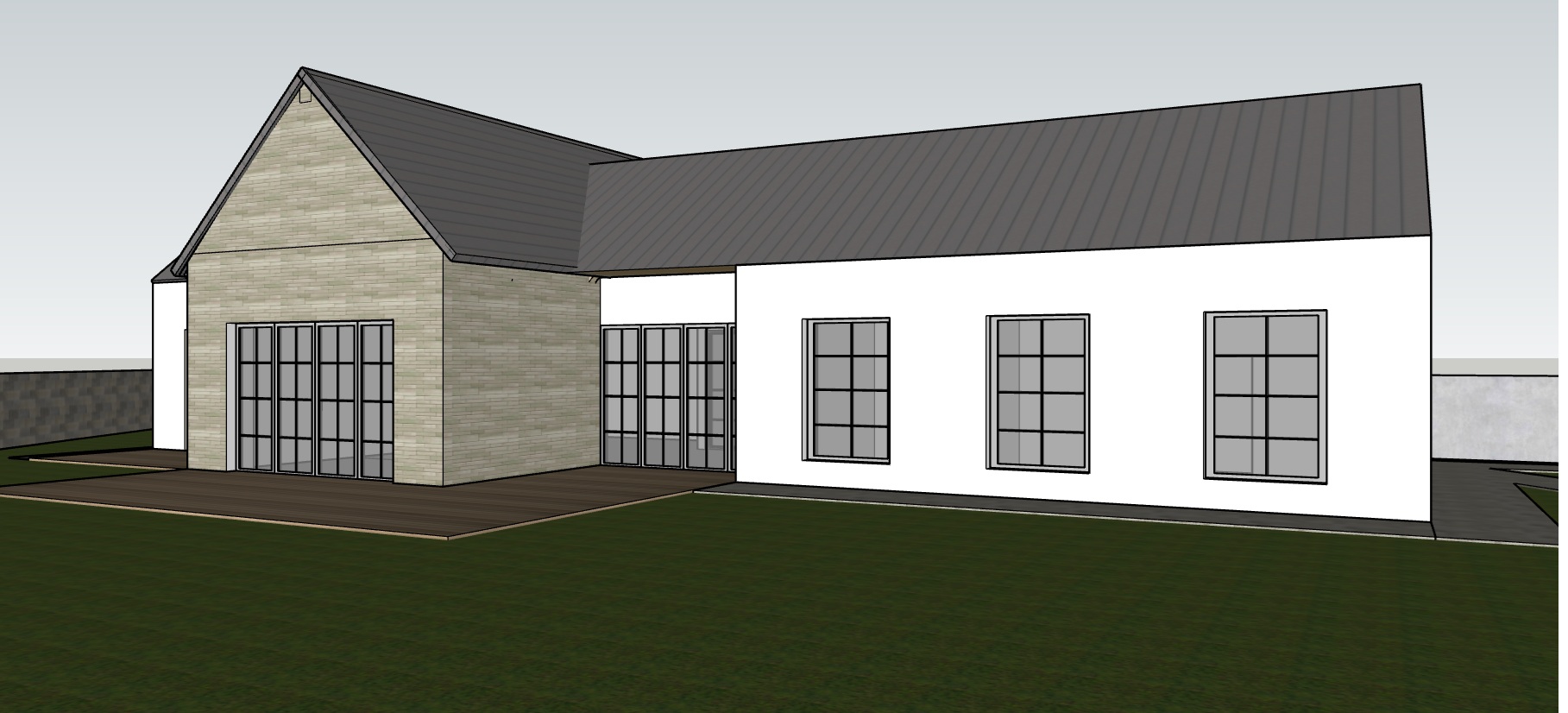 the goal is a modern english countryside aesthetic taking the house form from a particular reference i will alter the white walls to a creamy textured plaster black steel frames for the windows and doors are planned the landscaping will feature hydrangeas ornamental grasses boxwood the patio is evolving with stone slabs and grassy joints along with terracotta planters golden hour lighting will be used to enhance the cozy atmosphere a backdrop of mature trees and a greenery covered fence is envisioned