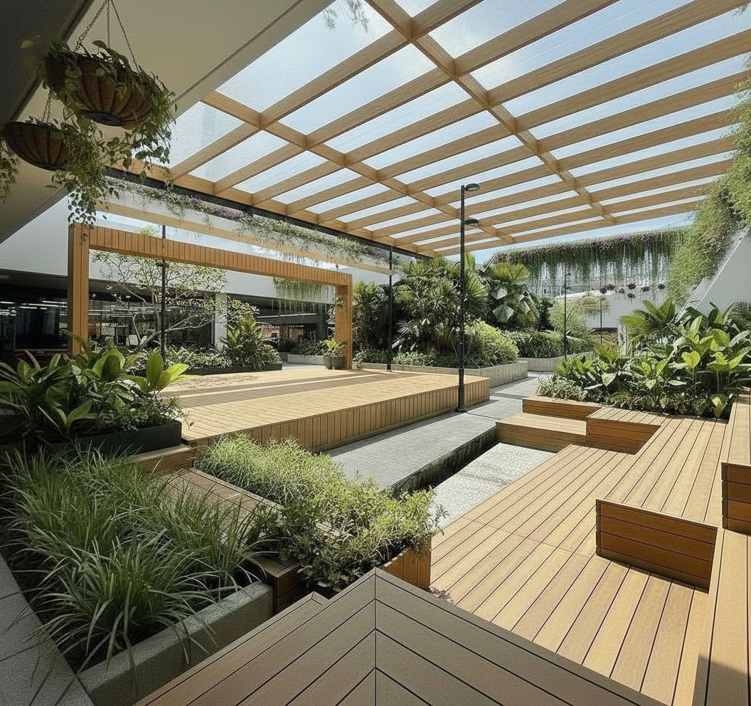 exterior shot add the red aia canopy logo on top of the stage frame