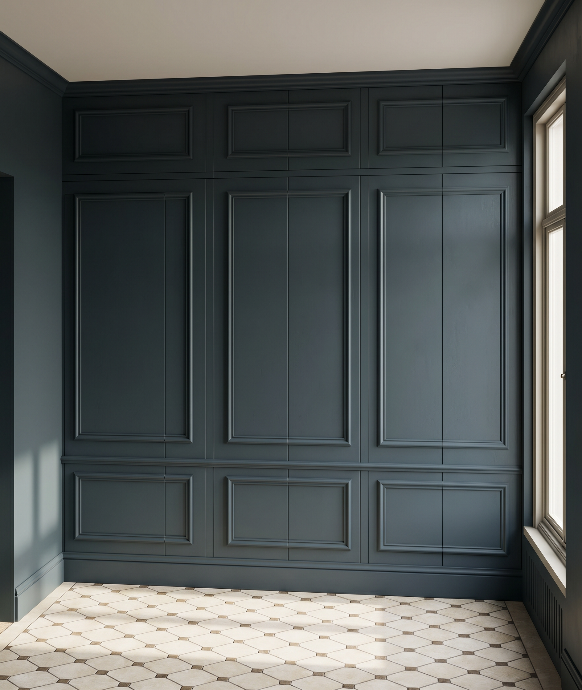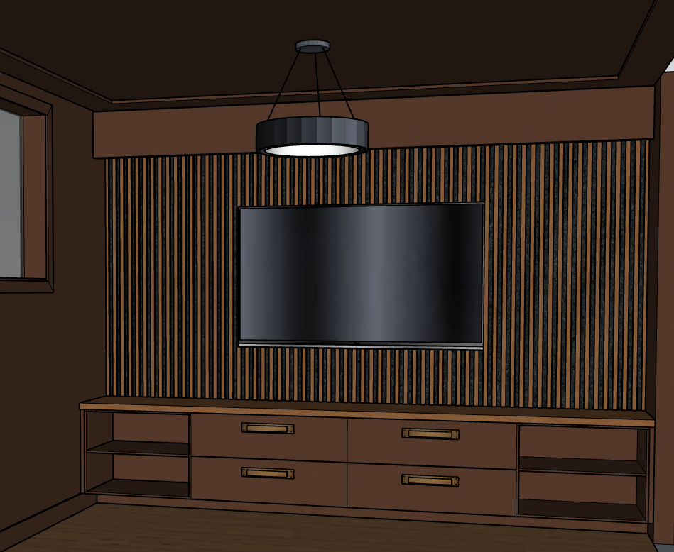 there should be small pot lights on each side of the tv and lighting at the toe kick of the cabinets no lighting inside of the cabinets the walls ceiling and cabinets are the same colour