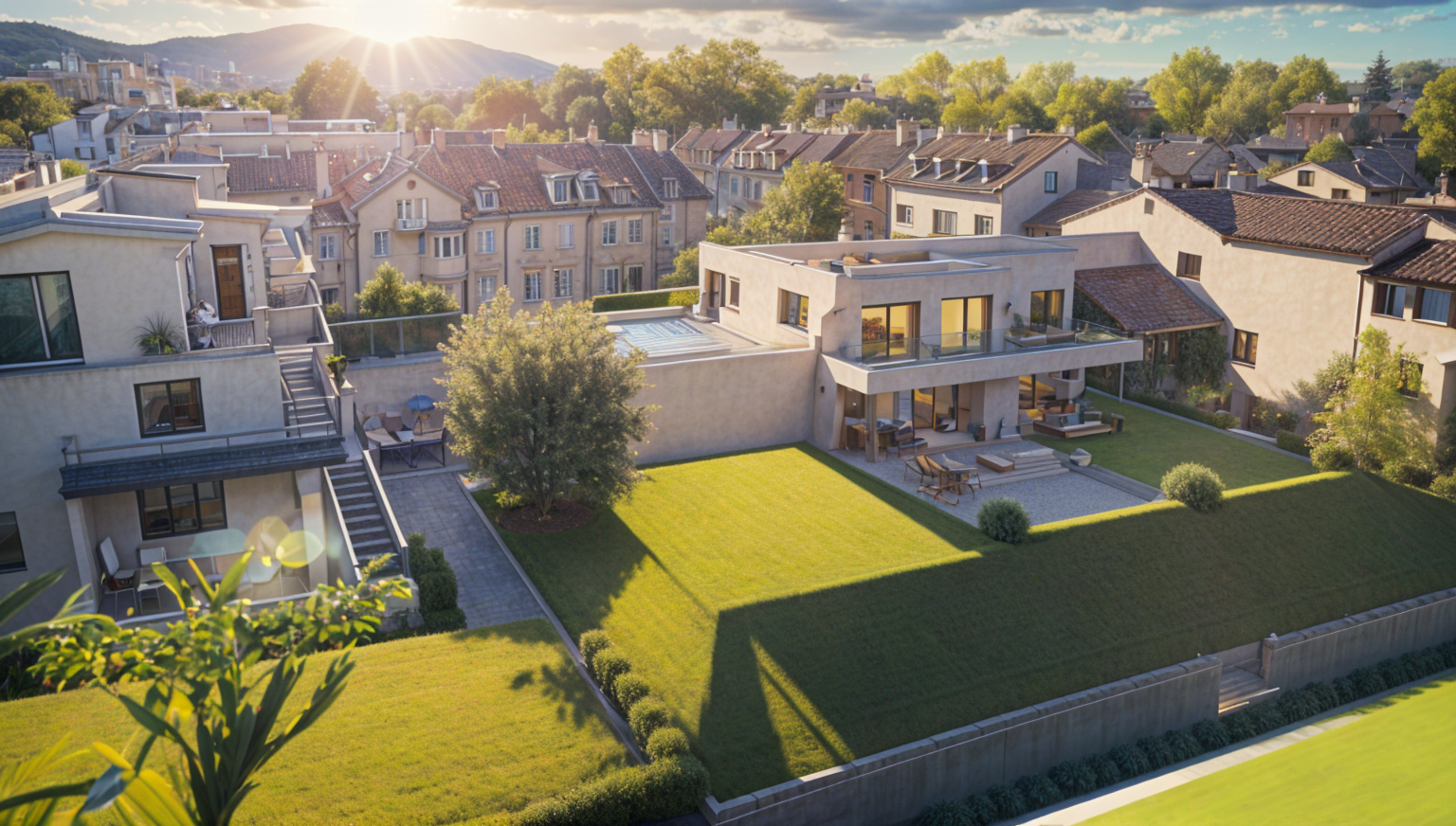 realistic dusk manicured grass window reflection