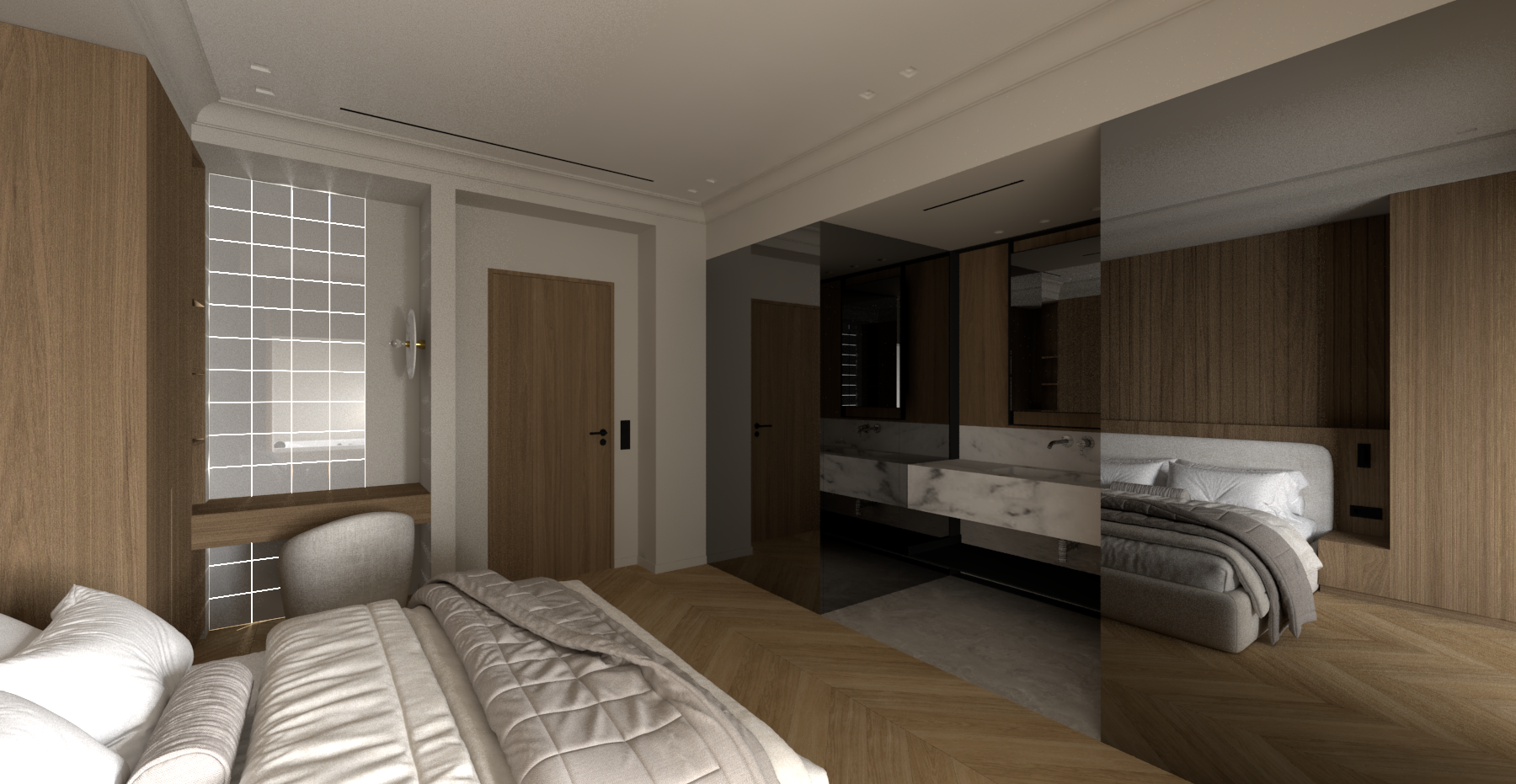 create a realistic high resollution materials image switch on lights do not redesign the geometries or styles at the left there are wall by satine glassbricks no transparent physical light inserts from there