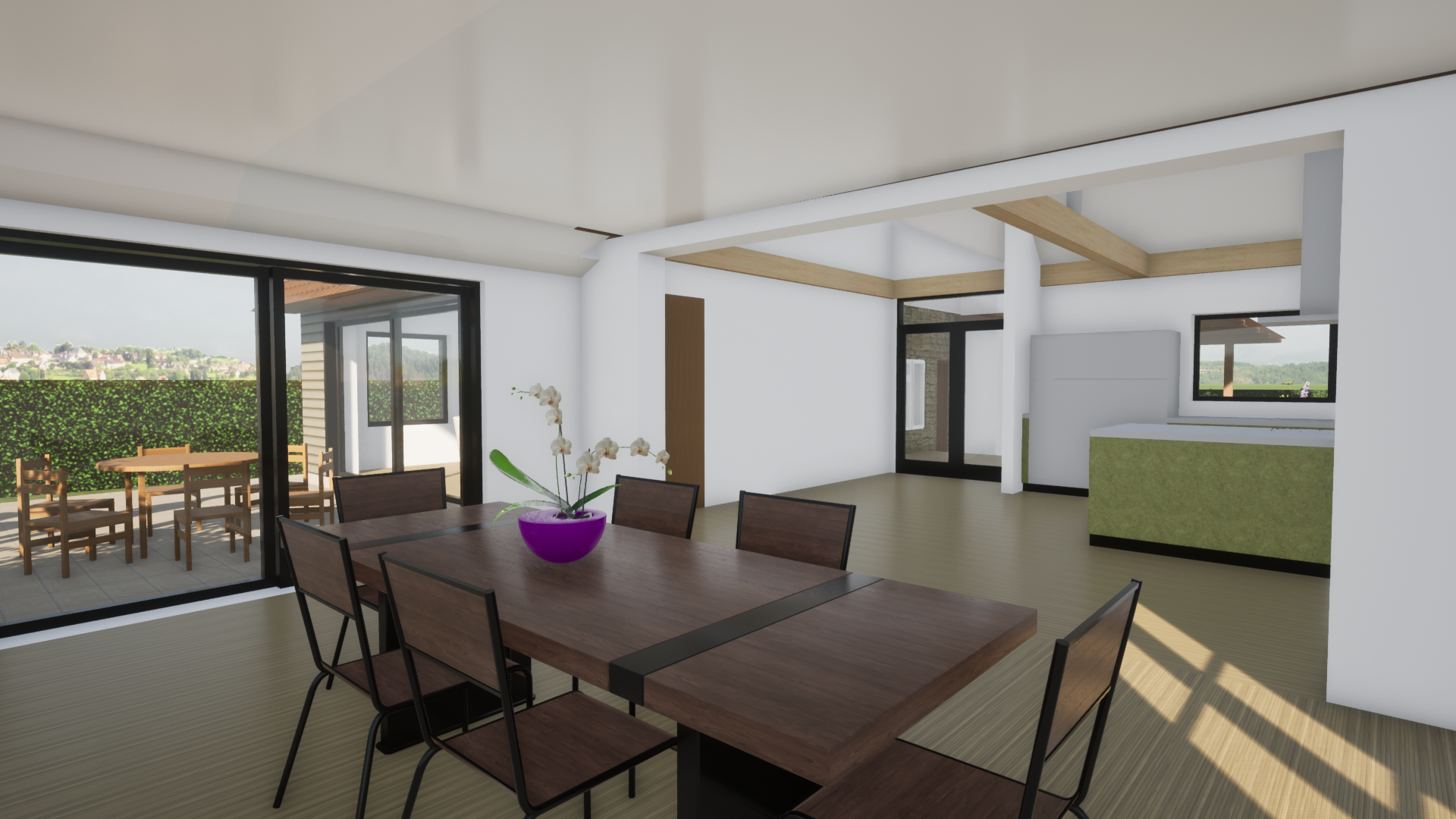 contemporary interior of an open plan kitchen with oak dining table large marble worktop on green island unit tall vaulted ceiling beyond lower flat ceiling glulam frame with natural larch finish inset led lighting below afternoon sun wood strip flooring throughout