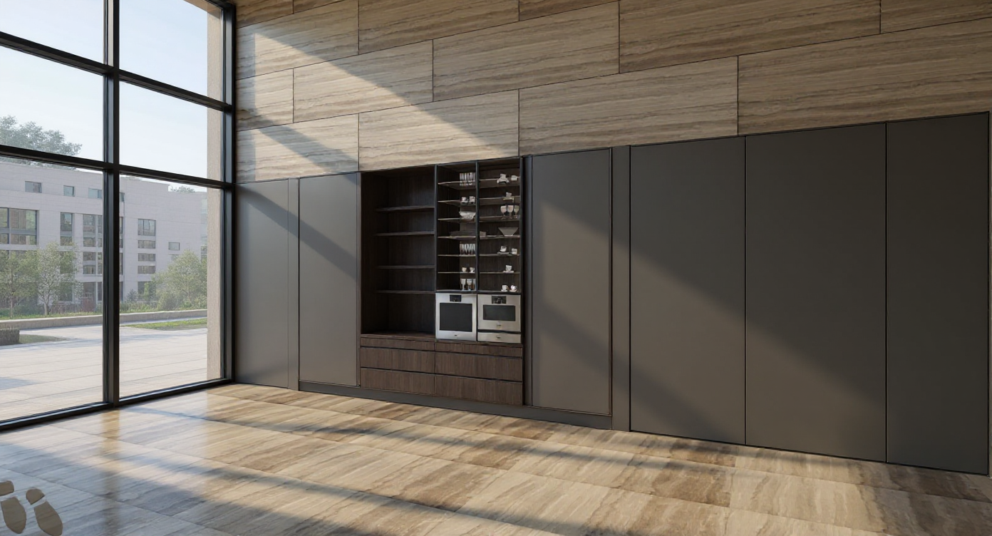 maintain the original details exactly and improve photorealism interior of a modern kitchen featuring sleek cabinetry integrated into a minimalist wall gaggenau expressive appliances the surrounding walls are a smooth elegant gray travertine while the adjacent upper sections are also grey white travertine the tall windows framed in charcoal black flood the space with natural light floor tiles are a soft white travertine with subtle marbling providing a neutral sophisticated foundation the atmosphere is airy and contemporary with an emphasis on clean lines and open space