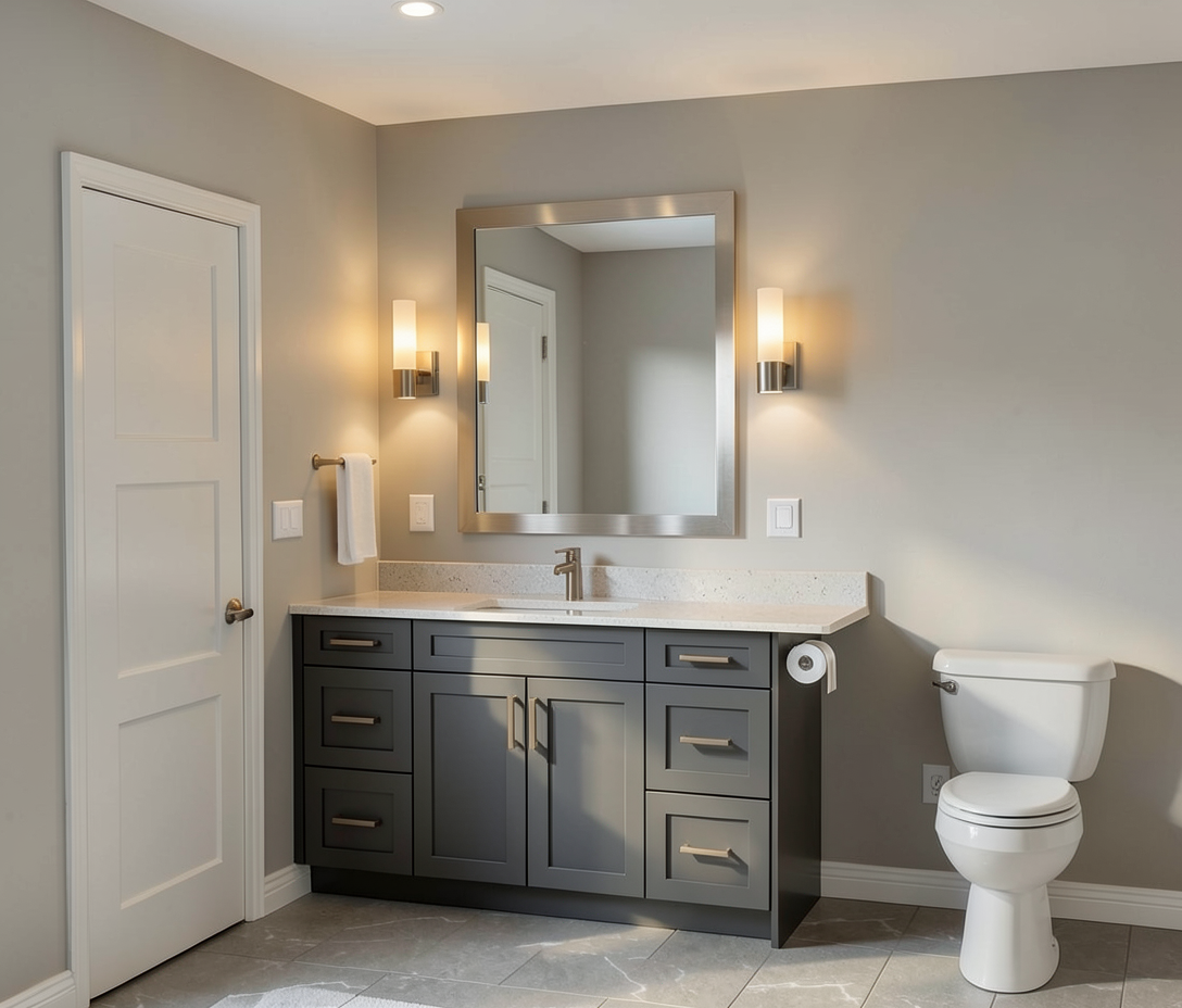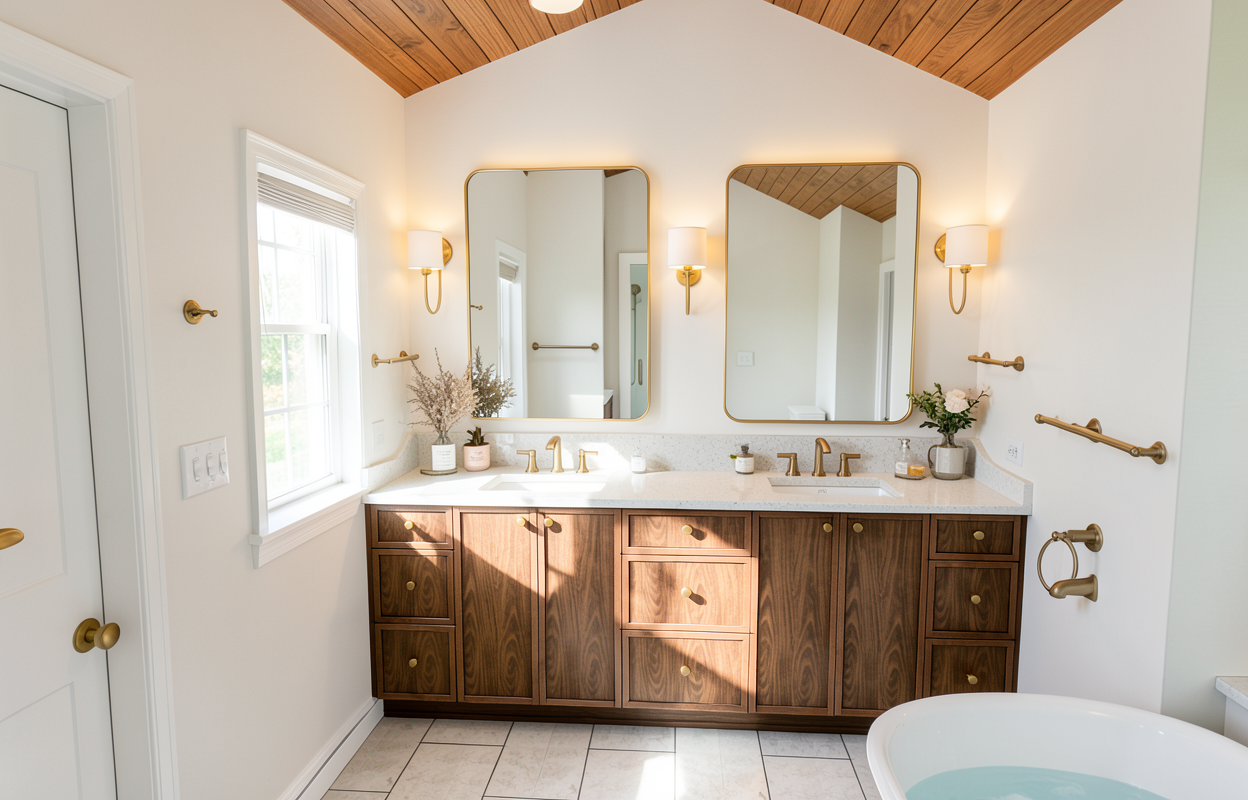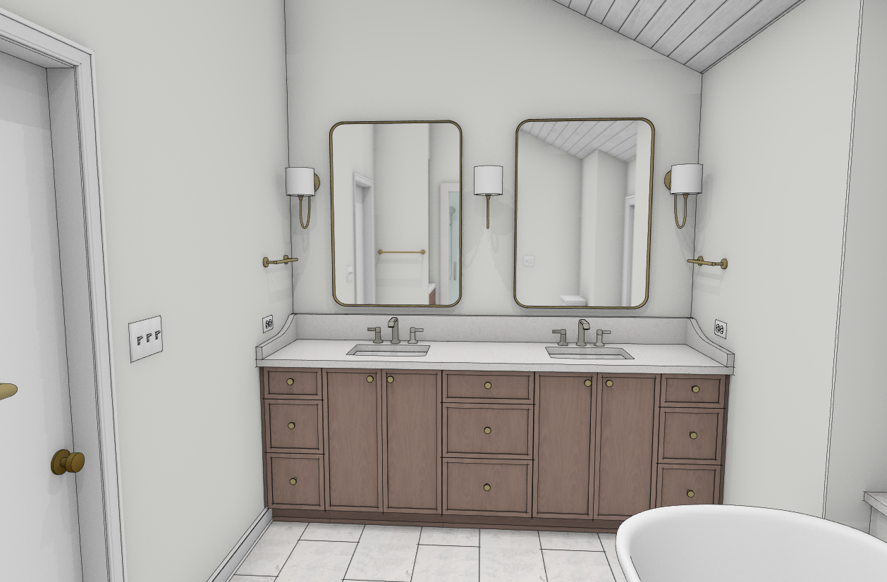 add bathroom accessories have daylighting from window but have lights on in room add water to bathtub wood v groove ceiling painted white medium brown quarter sawn oak cabinets with quartz top
