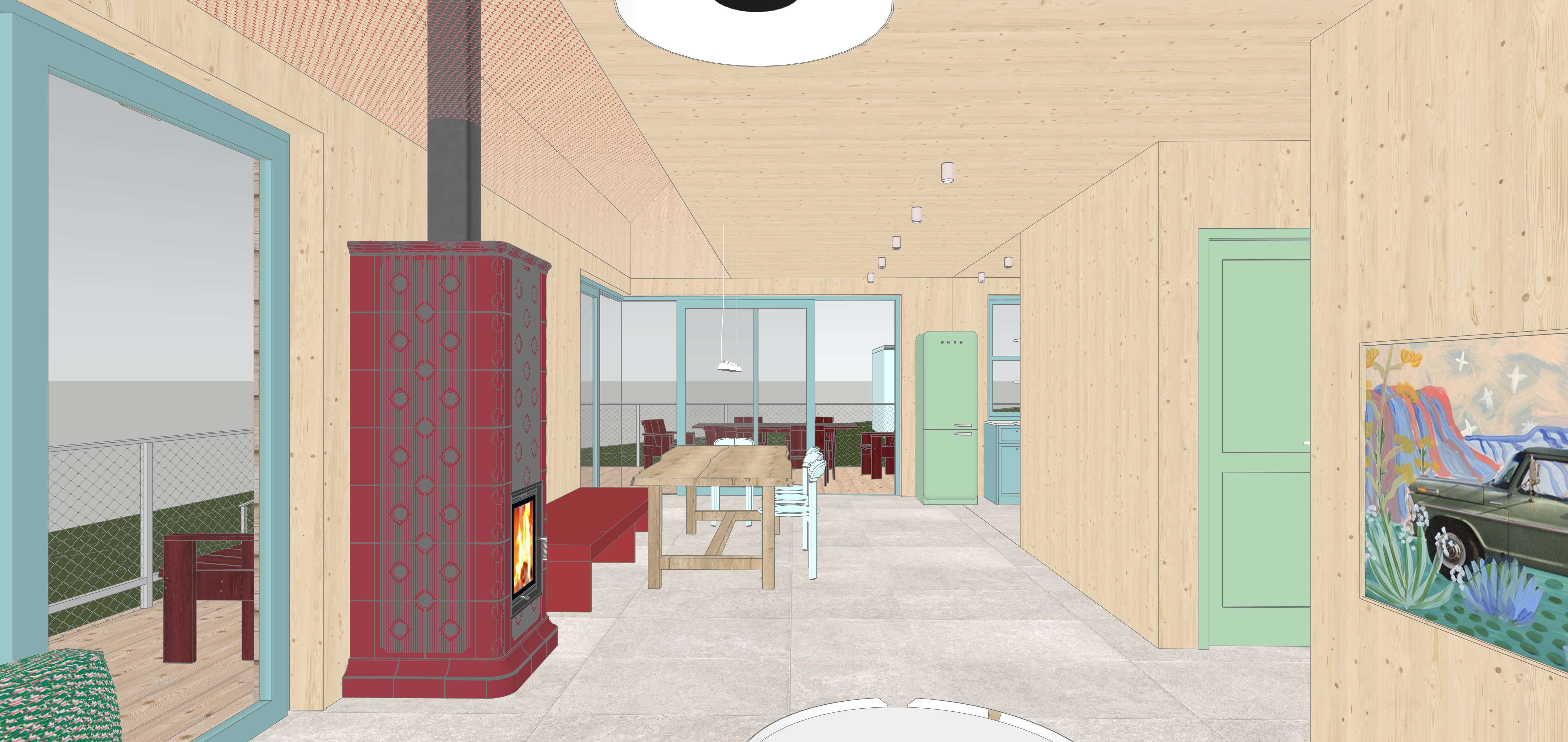 interior of a cabin made of novatop wooden panels with lightly whitewashed spruce panels on the left side the ceiling does not extend all the way to the wall leaving a strip of white woven mesh there is a dark red tiled stove the windows are light blue and the doors are light green the kitchen unit is in the same blue color as the windows the flooring is light gray in a warm tone with a stone like pattern as in the design