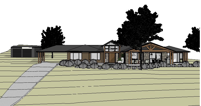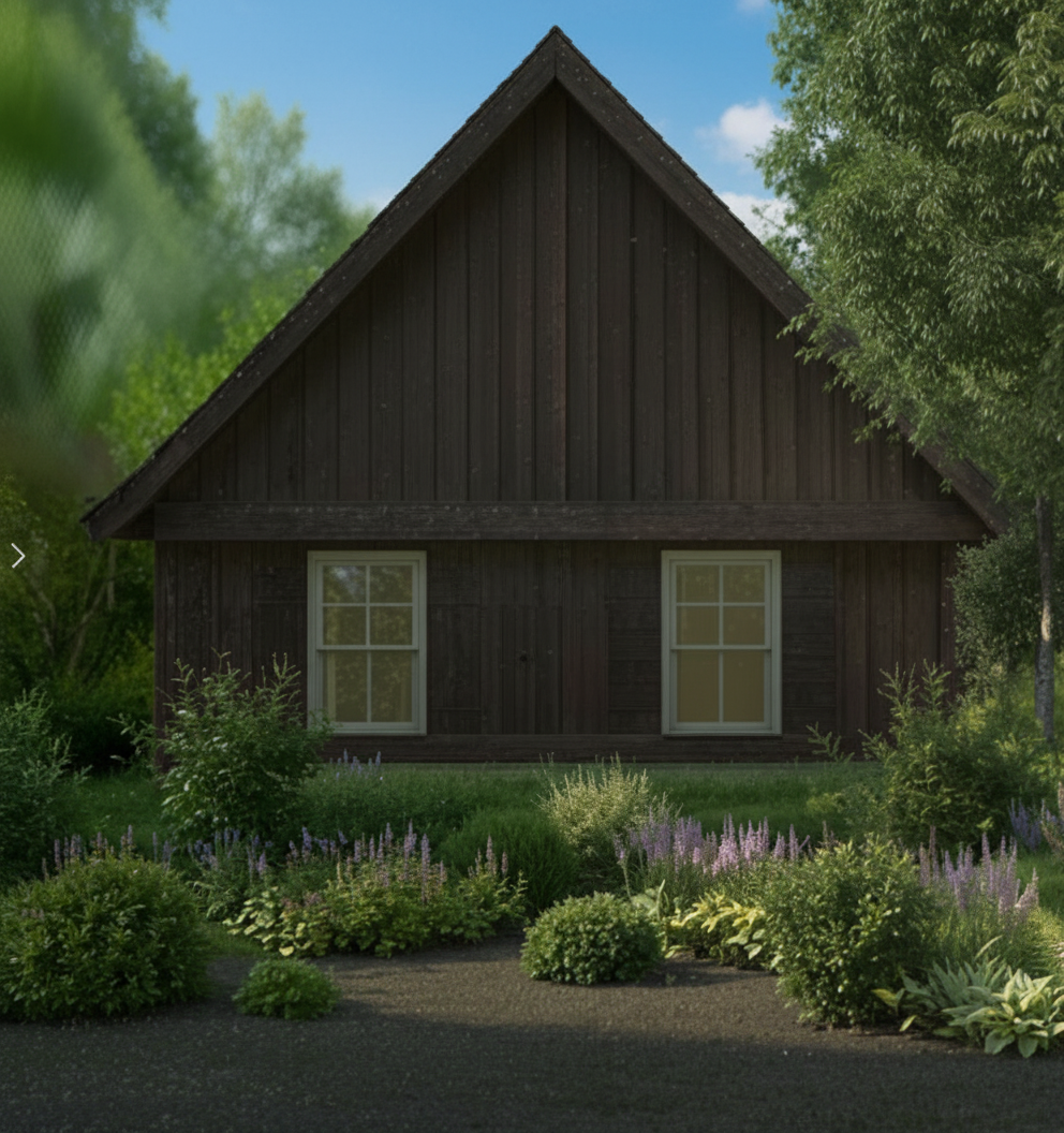 render a beautiful modern farmhouse set in a serene landscape the house is accented with warm wooden finishes and expansive glass windows the roof is a sleek charcoal color surround it with lush greenery and small bushes creating a vibrant garden setting add two tall elegant trees with dark green leaves for shade and depth the sky is clear and bright casting soft natural daylight enhancing the earthy tones a smooth concrete driveway leads up to the house the atmosphere is peaceful and inviting reflecting a perfect blend of architecture and nature