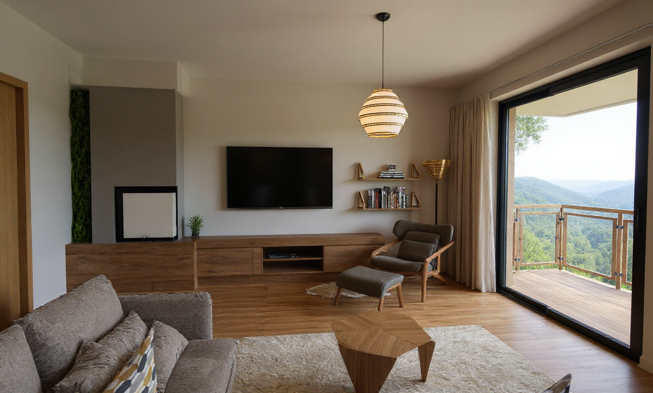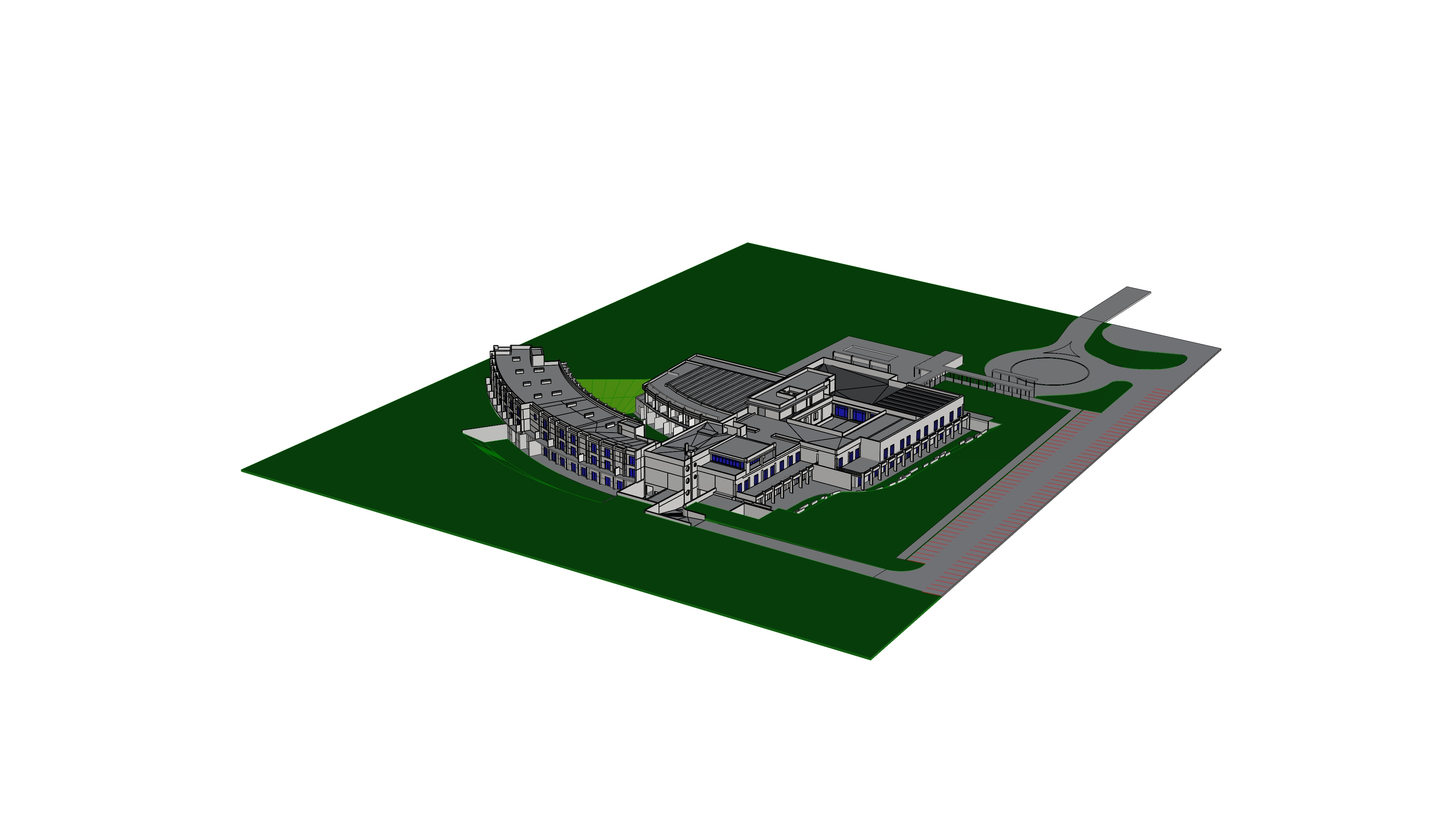 aerial shot an axonometric view of the structure from above with a lush green landscape that blends in with the surrounding landscape making the difference between the new greenery and the surrounding landscape indistinguishable i would like a rendering of this image don t change the structure what you see in green are the green grass areas what you see in gray is the driveway with a roundabout the background photo is the context into which i would like to photo insert the rendering with the green landscape make everything photorealistic and maintain this perspective