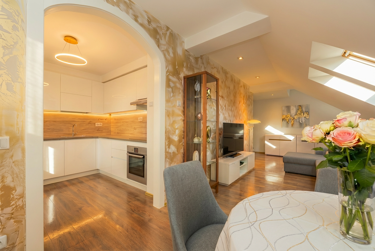 sundowner with soft shadows few clouds in the sky birds flying in front a terrace caf scene with brown wood outdoor furniture tables and chairs populated with a bunch of semi transparent people sitting in front oft he building talking drinking coffee and walking by with a dog above the glass fa ade there is a rooftop caf with outdoorseating with brown wood outdoor furniture tables and chairs populated with semi transparent people sitting include a glass railing around a planted tree existing tree preserved realistic reflections and light modern minimalist architecture featuring clean lines and open spaces style scandinavian minimalism clean geometry high realism soft warm lighting color oft he lightning warm gold yellow beige camera eye level from the front facade made of sand limestone slabs format 120cm wide and 60cm high windows made of oak terrace floor made of sand limestone slabs format 120cm wide and 60cm long flat roof with a copper plate cover on the edge of the roof the glasfacade made of oak window frames in the background are some small family houses with trees in the upper left corner a tree should look in on the right side there is a path along the building with trees