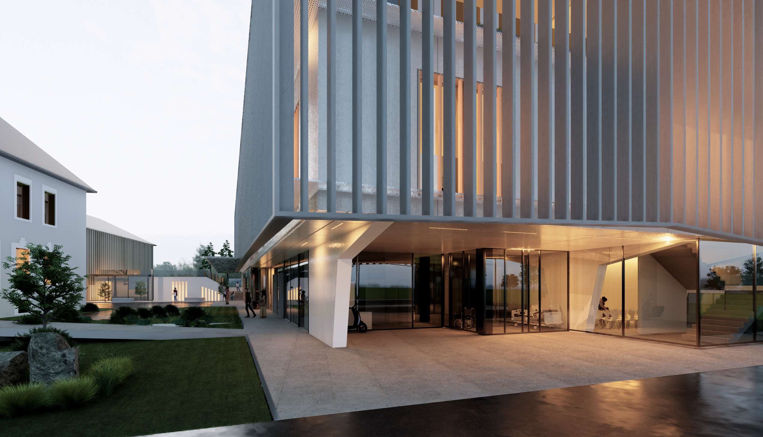 modern architectural building with a clean minimalist design surrounded by lush greenery the building has white panels and large windows reflecting a sleek contemporary style the roof is subtle terracotta red adding a touch of warmth the sky is soft pastel peach creating a tranquil atmosphere during sunset the water in the foreground mirrors the building with ripples showing in shades of deep blue and reflections of the golden lights the environment is peaceful with ambient lighting coming from the surroundings that highlights the architecture elegantly autumn mood keep the equipment inside the right building