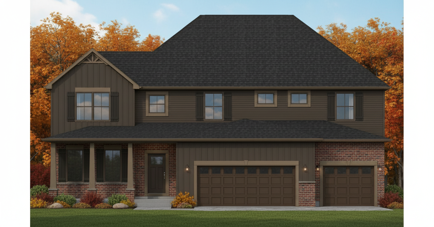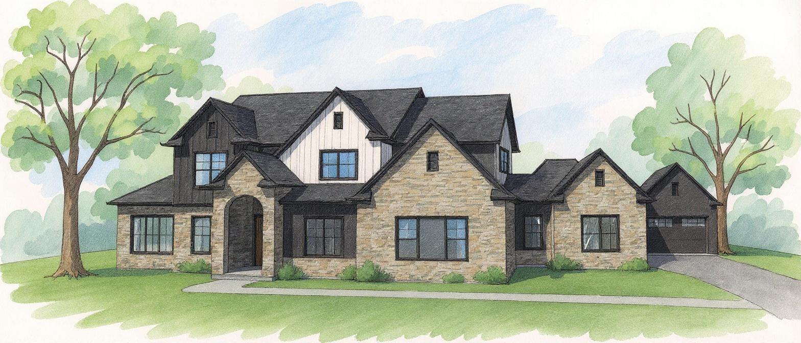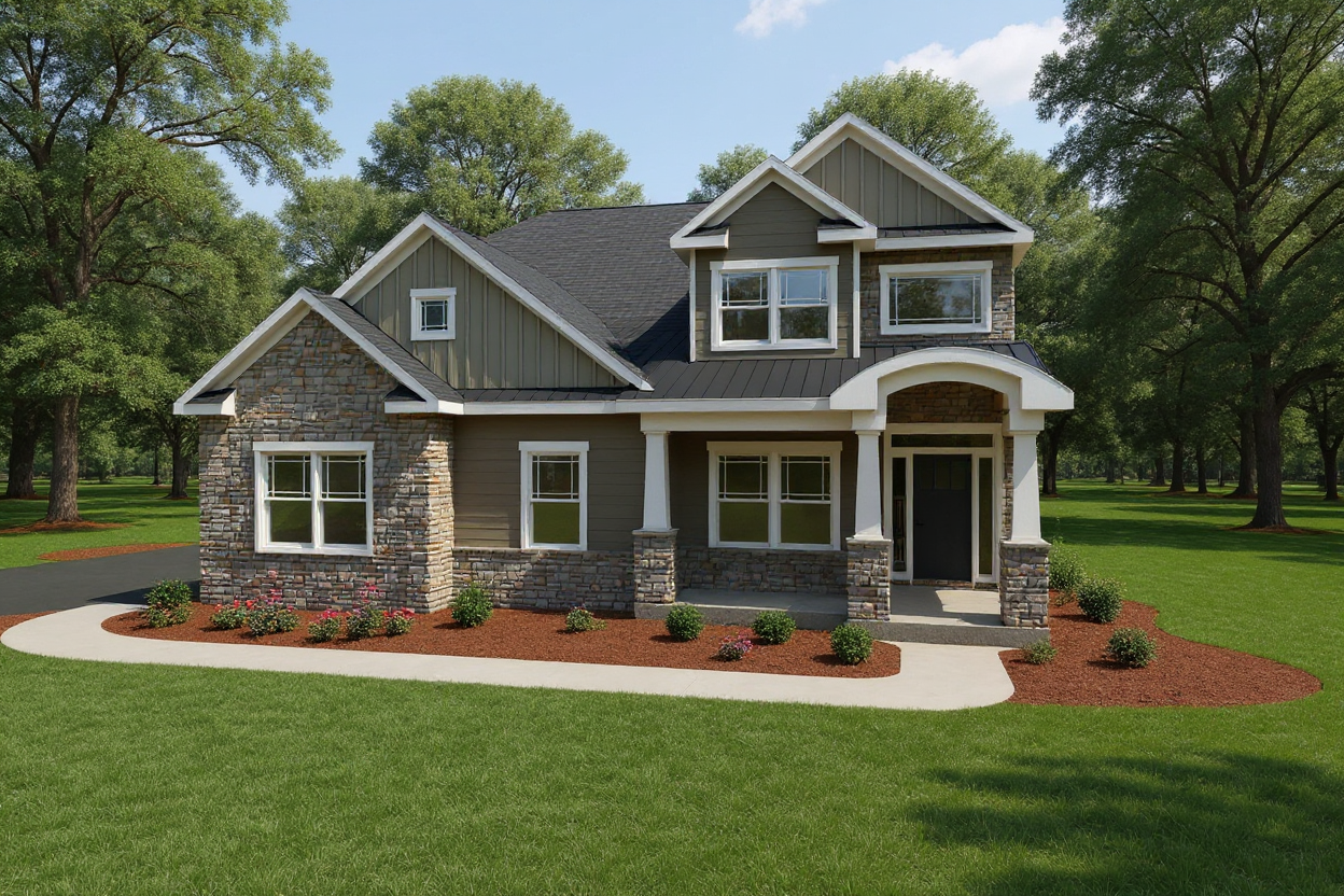 render a luxurious country house with natural stone walls in light beige and soft gray colors the roof should be a classic charcoal gray with elegant black trims the windows are framed in dark polished wood surround the house with lush emerald green grass and a smooth charcoal driveway leads to the front in the background a clear blue sky with a few fluffy white clouds sets a tranquil and inviting atmosphere add soft golden sunlight to enhance the warmth and beauty of the scene